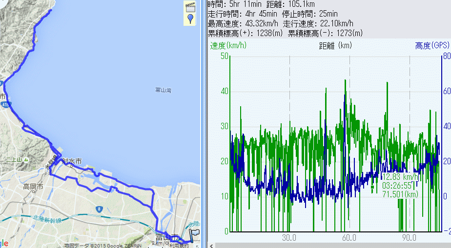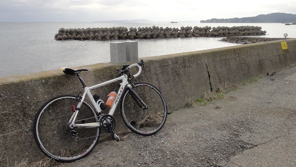県境七尾 104km (2015.11.21) 予報は降る降る詐欺と断定、10時に出発直後は路面は濡れていたが、北西の風ですぐに乾いた。ridleyは重い上に向かい風で1044の渡船には間に合いそうになく牧野大橋経由で伏木へ。如意の渡の義経と弁慶。氷見の「ひみ浜」の店頭に「ブリあります」の文字、まだ寒ブリ宣言は無いがそれなりの大きさなんだろう。阿尾デイリーで休憩。風は北東に変わり完全な向かい風でノロノロと県境到着。復路は氷見港まで追い風。2週前まで飛びまくっていた赤トンボは一匹も見掛けず、コオロギの声も聞こえず、気温は高いがやはり冬である。サイクリングロードで松田江の長浜、海には人っ子一人居ない。1407の渡船は「かいりゅう」だった。今年最後の乗船かも。15時過ぎに帰宅。17時からの職場25周年パーティーに間に合った。