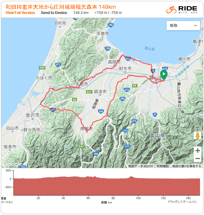 和田川左岸台地から庄川城端福光森本 148km (2016.05.08) 8時45分出発、雲一つ無い好天微風と絶好の自転車日和。県南西部に向かう際に定番化してる旧R8+農道+K9+K239の経路で和田川左岸台地へ。景色が素晴らしく上りが苦痛にならない。R359を下って安川のサークルKに着けば、ローディの大集団20名以上は居るが2グループかな。大きな方のグループが庄川方面に向かう模様、グランフォンドの試走? コーヒーとドーナツで補給してる間にもう一つのグループも居なくなった。 当初は砺波福野経由を考えていたが、庄川経由も良いなでヂブンもK11を南下、強い追い風が吹き始め上りも楽々。庄川のサイクルステーションにはバルバの速そうな集団。三楽園前からR156に上がり井波へ、瑞泉寺手前で白い象を引いた花祭りの行列。井口から城端は田園の中、麦が少し色付いてきた。城端は日本抵抗器前の橋が再び通れる様になり、善徳寺の修復工事も終わっていた。福光へのR304でローディ女子3名の珍しいグループ、ちょっと筋力不足な感じの漕ぎ方だった。なんと一服茶屋で補給休憩、火伏饅頭なる酒饅頭110円。 今年は坂練はサッパリなので県境越えでは最も楽なR304をそのまま進む。トンネル手前でGIANT、県境手前でGIOSをそれぞれ挨拶しつつ追い抜く。ヂブンと似た様な年齢かな? 風がどんどん強くなり、しかも乾き切った空気で喉がいがらっぽい。森本から旧道に入ると完全な向かい風、25km/hの維持もしんどい。津幡まで我慢我慢で森乃庵のもりそば大盛りで昼食休憩。何度か来てるが今回が最も混んでて蕎麦が出てくるまで20分掛かった。 道を間違えるも太白小学校下で引き返して傷浅し(笑)、旧8で津幡川を遡り倶利伽羅、天田峠は短いとは言え今季初めての坂らしい坂、HRは148まで上がった。メンヘル小矢部裏からK32、聖人橋を渡り小矢部川右岸堤を三日市橋まで下り、旧道から高岡市街へ。ずっと続く向かい風にうんざりしつつ、まじまに到着補給休憩、変わらぬ150円の巨大ソフトにありがたや。 新湊まで北上、県営渡船は20分以上の待ちあるも新湊大橋を歩いて渡る気力無し。海王丸パークで写真撮ったり何も釣れない釣り人の群れを眺めたりで16時7分のかいりゅうで堀岡へ。四方まで向かい風に苦しみ、射水線跡の南下でようやく風から解放。17時ちょうどに帰宅。今季初のほぼ150qは疲れた〜、今年はグランフォンドにエントリーしてなくて良かった(笑)。 ![]() ルートラボ終了のためridewithGPSに移行、本日はロガーでデータ全く取れず、原因不明 |