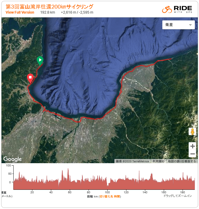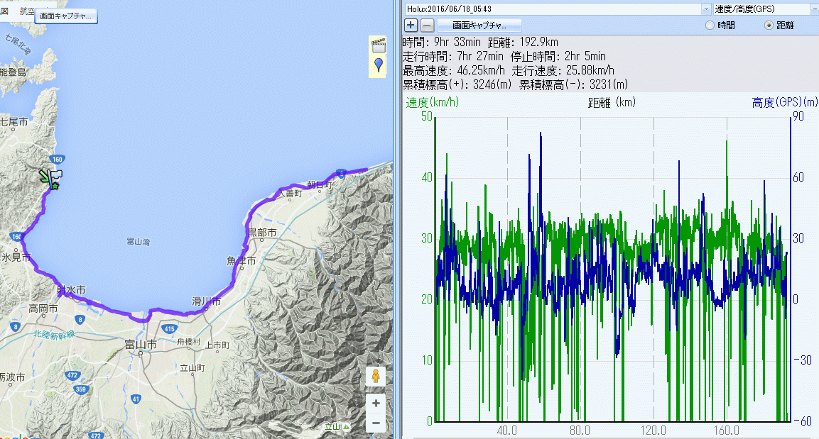 本日のロガーデータ 帰路の阿尾でロガー落ちで10q欠測、コンビニに入ってる間かな。走行7時間27分、停止2時間5分、平均25.88km/h、二人だと速度は上がる。 昨年は走行8時間17分、停止1時間54分、平均24.42km/h。一昨年は走行7時間58分、停止1時間53分、平均速度25.41km/h ![]() ルートラボ終了のためridewithGPSに移行、10q欠測なので203〜4qの走行距離のはず。 |