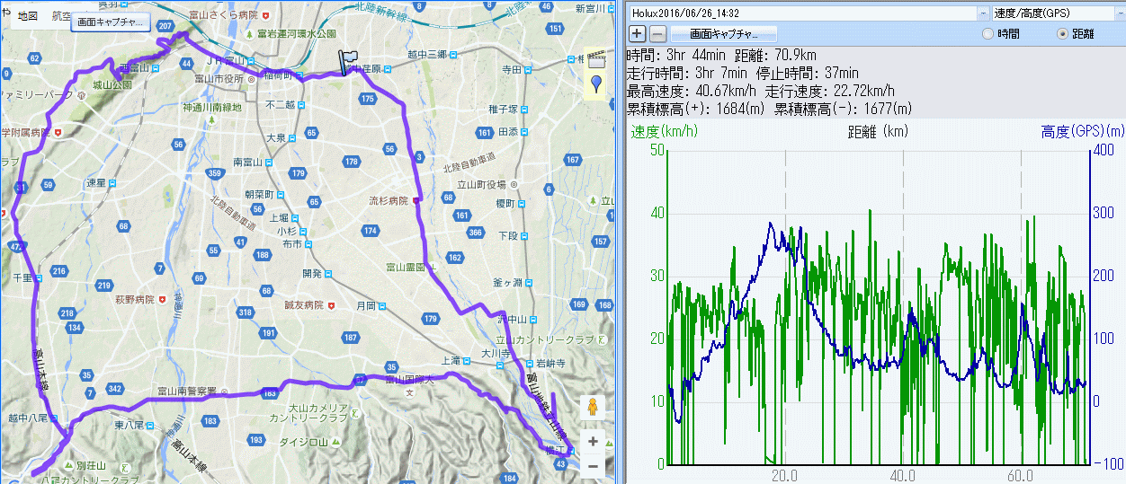 横江頭首工から八尾長沢呉羽丘陵 70km (2016.6.11) 14時半出発、ここしばらく海沿いばかり走ってたので今日は山へ。ホタルが居るらしい西の番霊園付近を通ってみるも、こんな場所は夜来る気がせんよ(笑)。雷鳥大橋から岩峅寺、あるぺん村横711で休憩。極楽坂方面を考えてたが入道雲がイヤな感じで方針変更。横江頭首工から常願寺左岸に渡り熊野川沿いを走って上滝黒牧から大沢野へ。下り坂だが向かい風で速度が出ない。青線が山沿いに引かれており多数の単独ローディとすれ違う。途中、オオタカとカラスのバトル、見事に白いタカで昔見た個体かも。 神通川を渡り八尾へ、とりあえず旧町てっぺんまで上り諏訪町から下る。おわら練習予定表、ニイニイゼミ、風鈴の音、夏だなぁ。JR八尾駅前から高山線沿いへ、新田のローソンで休憩後、県道344を下る。千里地内旧R472と合流するY字路でランニング中のスキークラブY下師範代とバッタリ。何と先週ロードバイク買われたそう。スキーにランに自転車って何だか誰かみたいですよ(笑)。ちょっと物足りなかったので長沢で下に降りず池多杉沢経由で呉羽丘陵を目指す。 古沢の交差点で演説準備中の柴田巧事務所スタッフに囲まれ「比例は柴田」と乞われますた。呉羽青少年の家下からめひの野園の爽快な道路、梨畑から城山に取り付き呉羽ハイツ上で西側の景色堪能、寺町には下りず旧8を渡って呉羽山に上る。今日は距離短めで残存体力たっぷりでそれなりに元気に頂上へ。今日走った山沿い一望気持ち良し。神通大橋から帰宅。梅雨の晴れ間の美しい光線に癒されました。