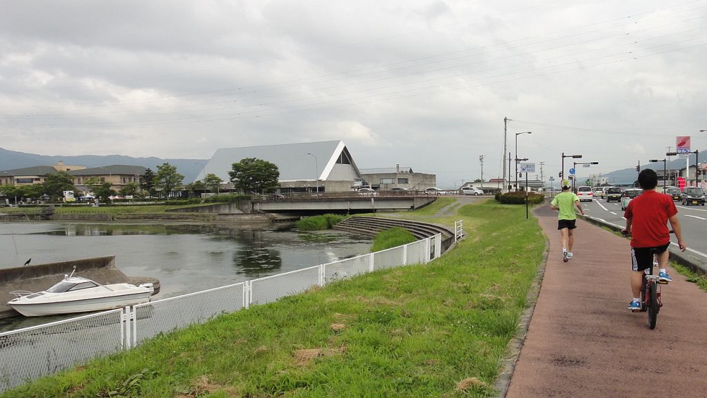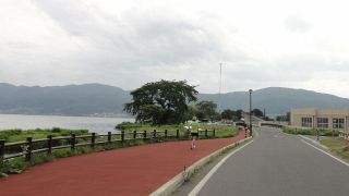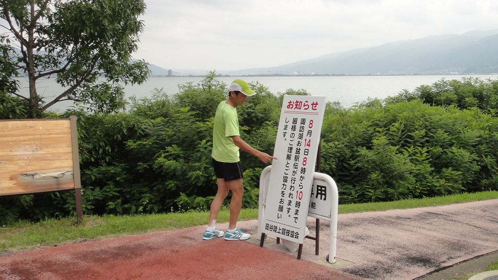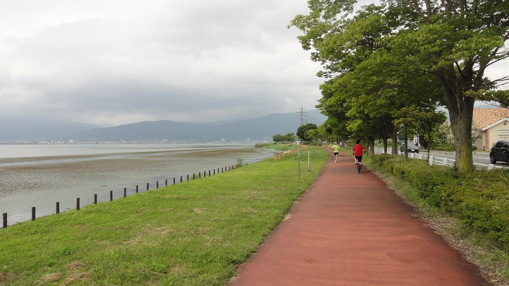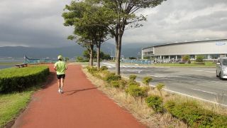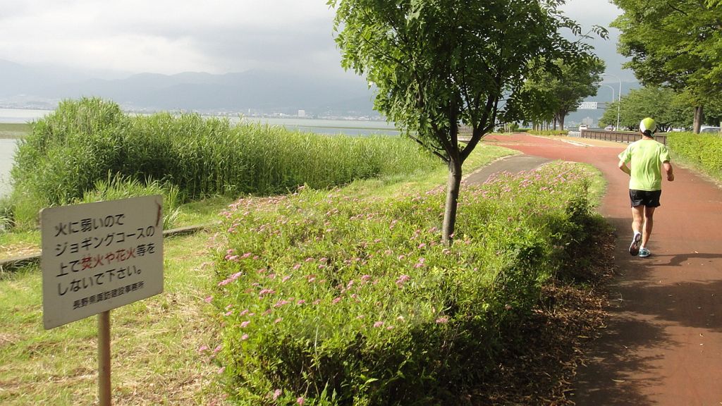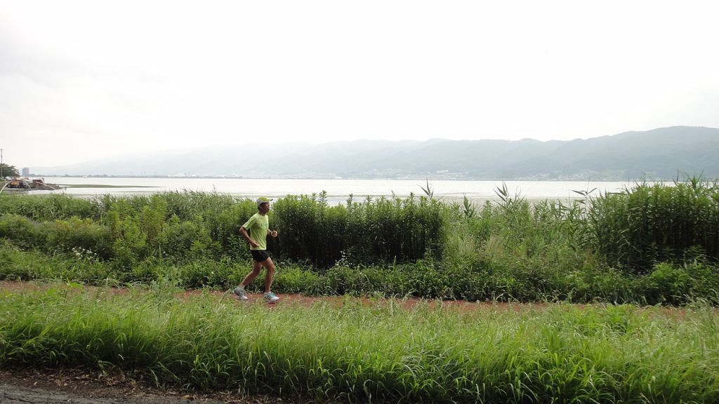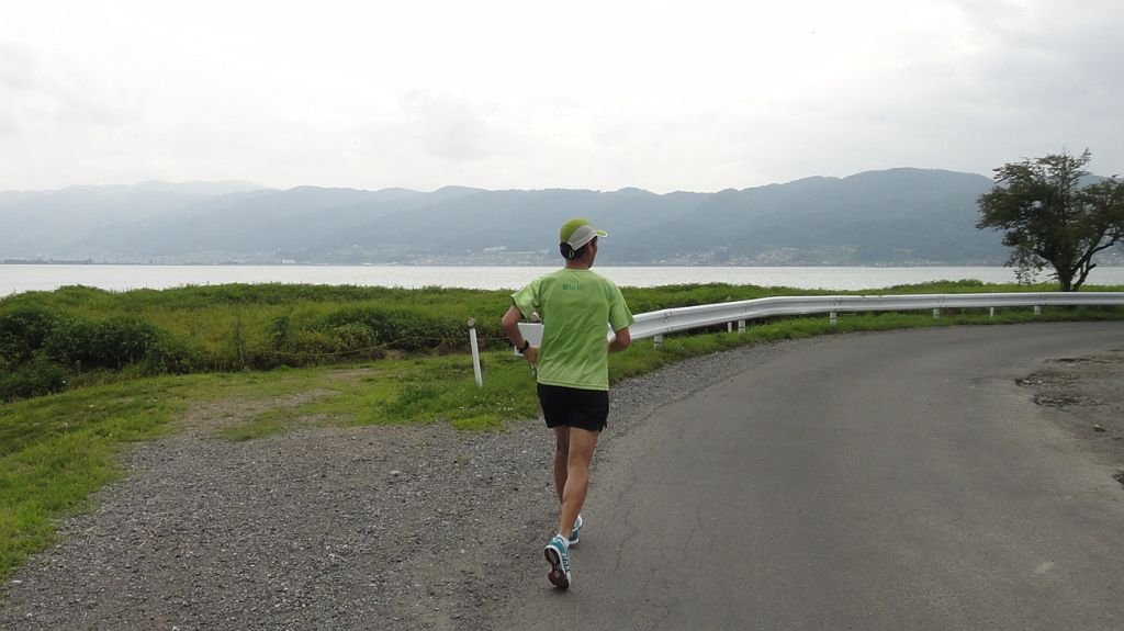諏訪湖を周回することに、しかも念願叶ってジョグ&ランでの左回り1周となった。石彫公園起点にスタート、妻子のDAHONをあらかじめ駐輪しておいた4q地点ハーモ美術館まで3人でジョグ、以降妻子は自転車に乗り換え、8q地点釜口水門で給水後、レースペースに近いランに切り換えて一気にゴール。次回機会があるなら右回りで走ってみたい。走後は真澄の宮坂酒造で美味しい試飲、温泉でゆっくりと汗を流し、暮れなずむ諏訪湖を眺めながらレストランくらすわで夕食と充実の一日だった。