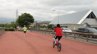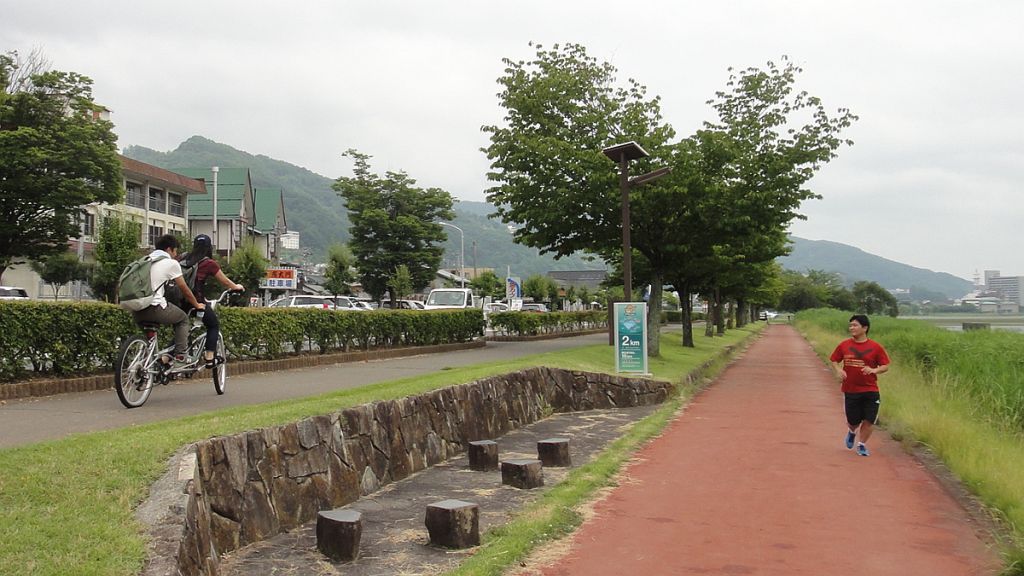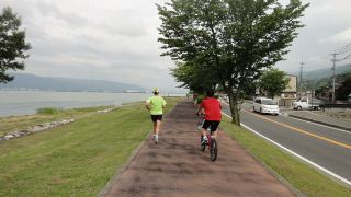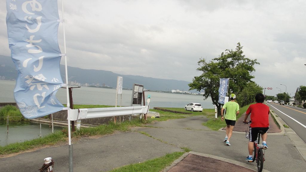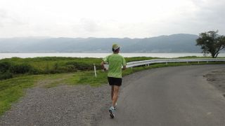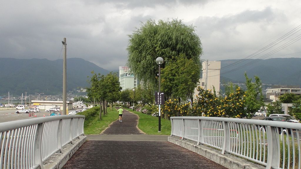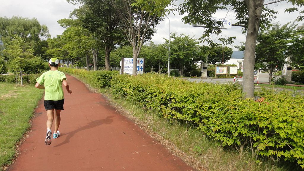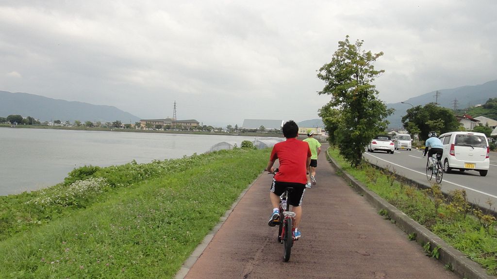 諏訪湖を周回することに、しかも念願叶ってジョグ&ランでの左回り1周となった。石彫公園起点にスタート、妻子のDAHONをあらかじめ駐輪しておいた4q地点ハーモ美術館まで3人でジョグ、以降妻子は自転車に乗り換え、8q地点釜口水門で給水後、レースペースに近いランに切り換えて一気にゴール。次回機会があるなら右回りで走ってみたい。走後は真澄の宮坂酒造で美味しい試飲、温泉でゆっくりと汗を流し、暮れなずむ諏訪湖を眺めながらレストランくらすわで夕食と充実の一日だった。