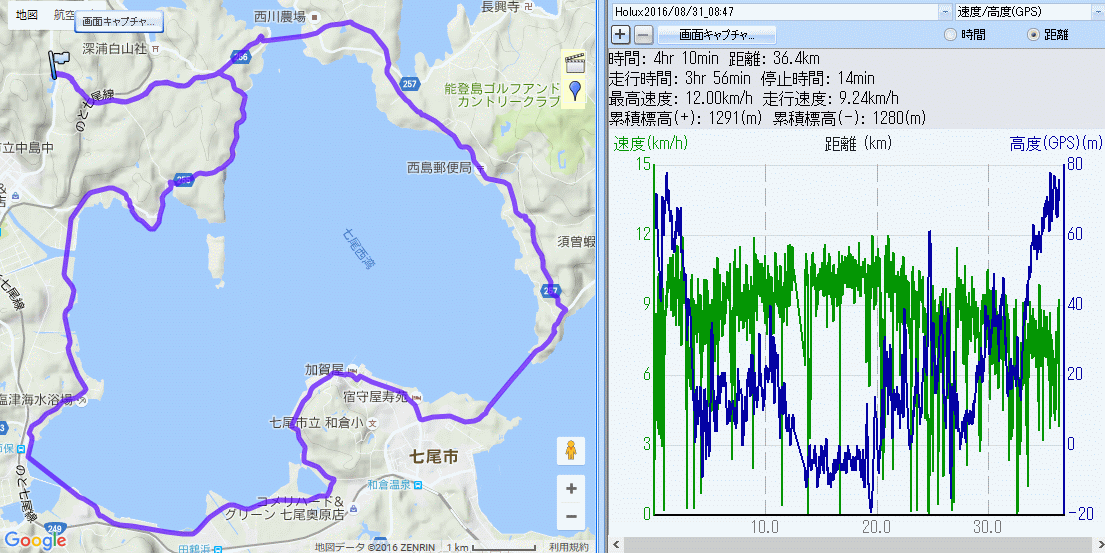 日曜出勤の振休使って、新潟対策第2段の36qLSD、道の駅中島ロマン峠から七尾西湾周回ジョグ36q。台風10号が日本海に抜けフェーン気味の暑さで大疲弊、予定の2度の補給に加え想定外の給水2回、ジョグでは5年振りに使うネイサンの2Lハイドレーション+500mlペットボトル2本、走後はさらに1リットルくらい飲んだ。ラストは歩きも入り練習になったか不明。まだまだマラソンの脚ではない。かつてロードバイクで3度はしった七尾西湾、ジョグだとエラク長く感じた。