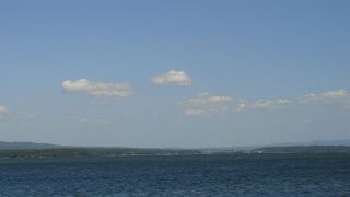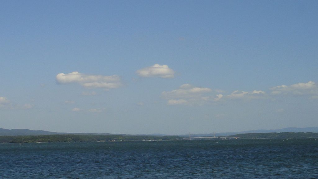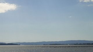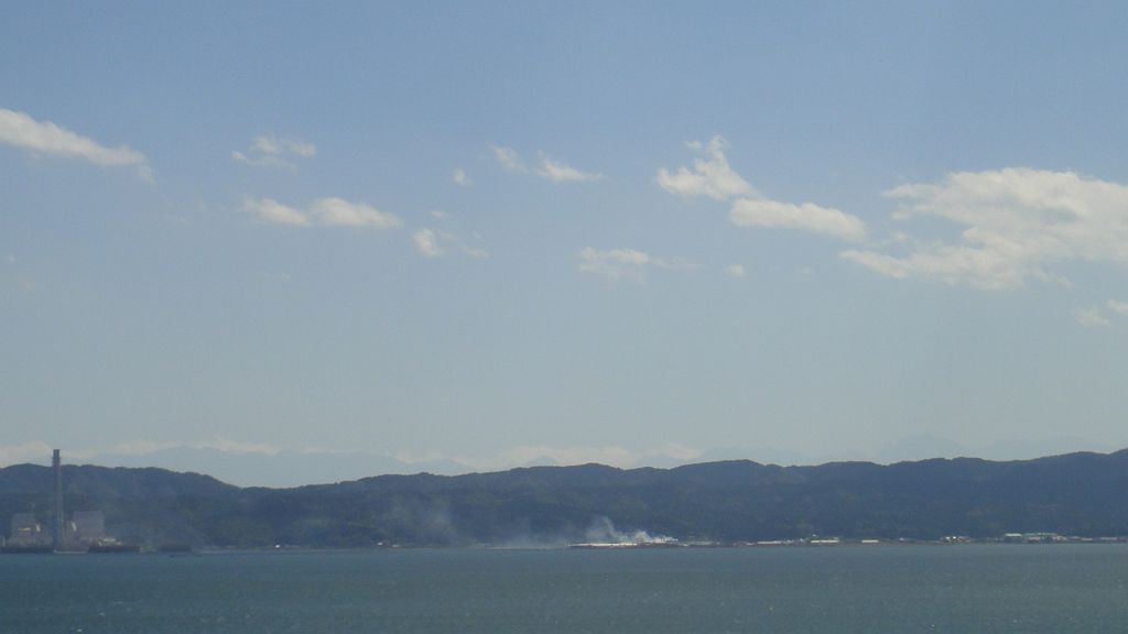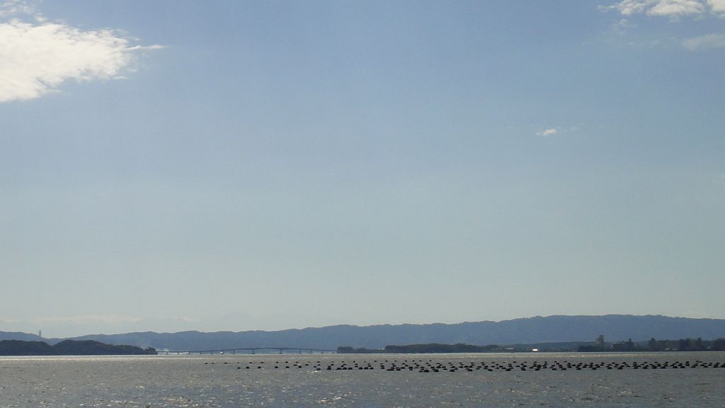 七尾西湾、能登島大橋の向こう崎山半島の上に立山連峰が見える