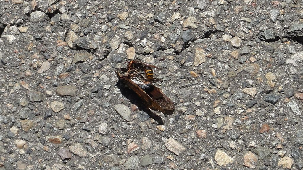 飛んでたセミが目の前に落ち、寿命?と思えば何とスズメバチが噛み付いていた
