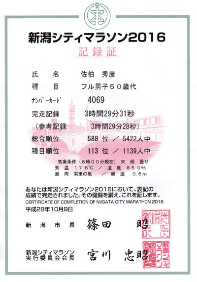 ■この復活?のフルマラソンまでの道のり? 1993年からランニング開始、翌1994年から大会出場も始める。 2011年に故障するまでの持ちタイム=自己記録(すべてグロス) マラソン 2時間57分55秒、ハーフ 1時間24分48秒、10km 39分14秒、5km 18分59秒 2011年11月 8日夜に左アキレス腱故障(右足で引っ掻き出血)、27日からランニング断念 2012年4月騙し騙しスロージョグを再開するも悪化、6月にジョグも断念 2012年 9月 ランニングを止めた代わりとして、ロードバイクに乗り始める 2015年 9月 スロージョグ再開 16日に県総合クロカンコースで3年3カ月ぶりの10qジョグ 2015年10月 滑川ほたるいかマラソン5q、4年半ぶりの大会出場、タイムは26分14秒(笑) 2015年11月 扇状地マラソンINにゅうぜん10q、タイムは1時間オーバー(笑) 2016年 4月 魚津蜃気楼マラソン・5q(伴走) 32分くらい 2016年 5月 黒部名水マラソン・10q(伴走) 1時間7分49秒 2016年 6月 坂井市古城マラソン10km 43分42秒 ハーフに備え、15qジョグを6回 2016年 7月 能登島ロードレース・ハーフ 1時間39分3秒 新潟シティマラソン・フルにエントリー 2016年 8月 フルマラソンに備え、31qジョグ、36qジョグ 2016年 9月 フルマラソンに備え、42qジョグ、21qペーラン 2016年10月 新潟シティマラソン・フル 3時間29分31秒 | ||