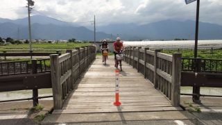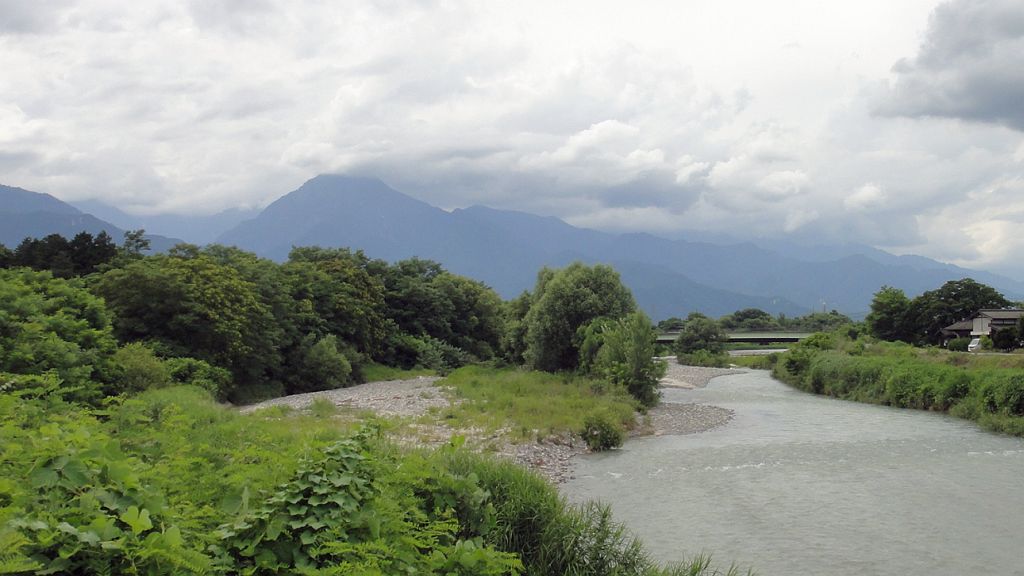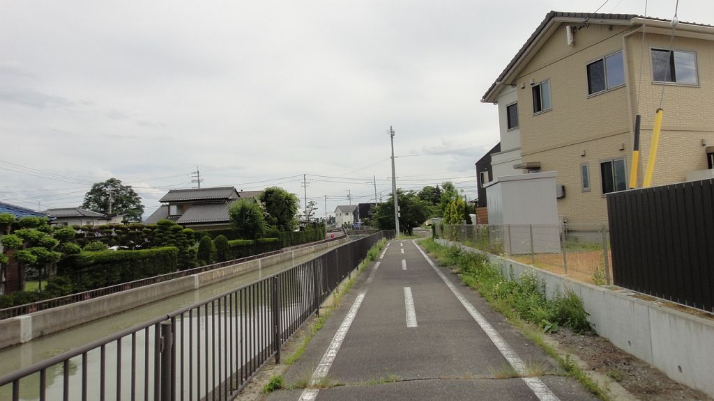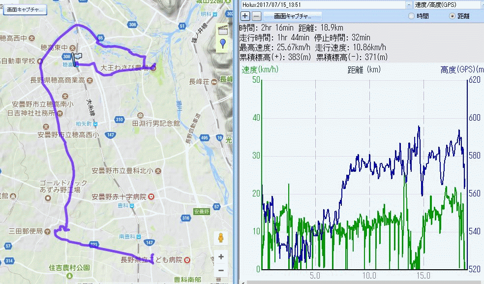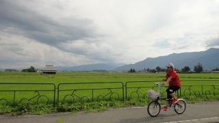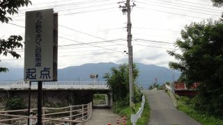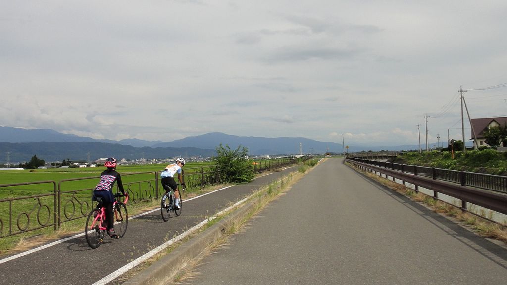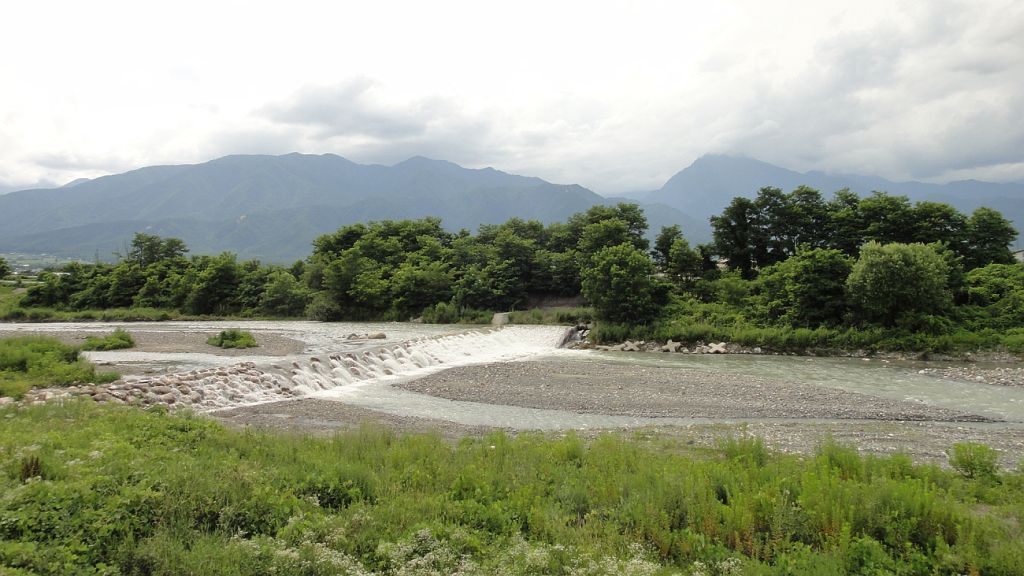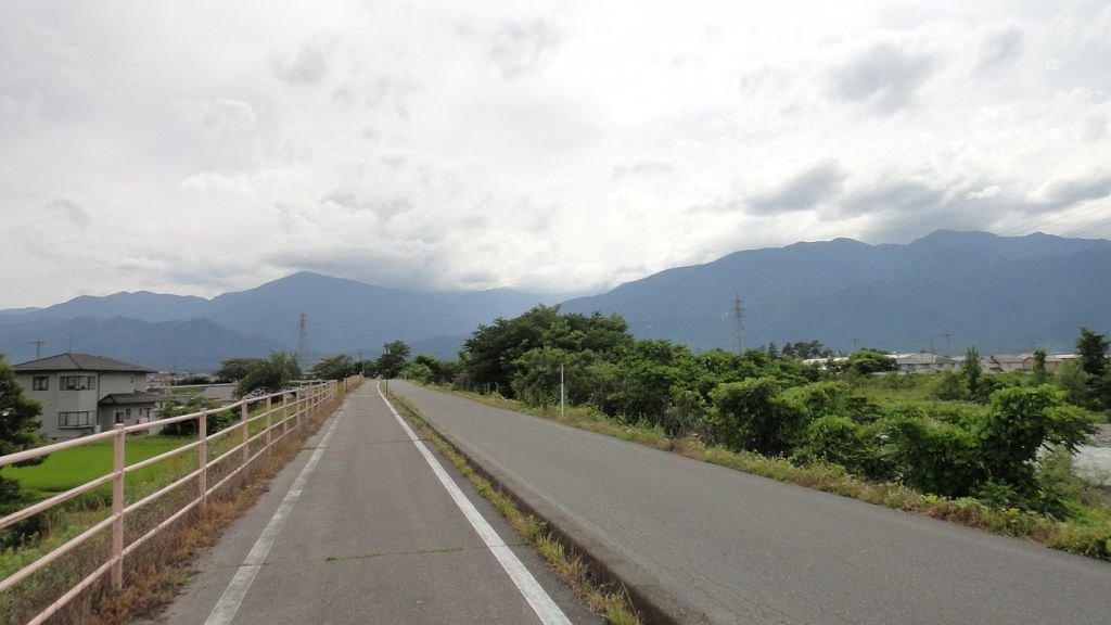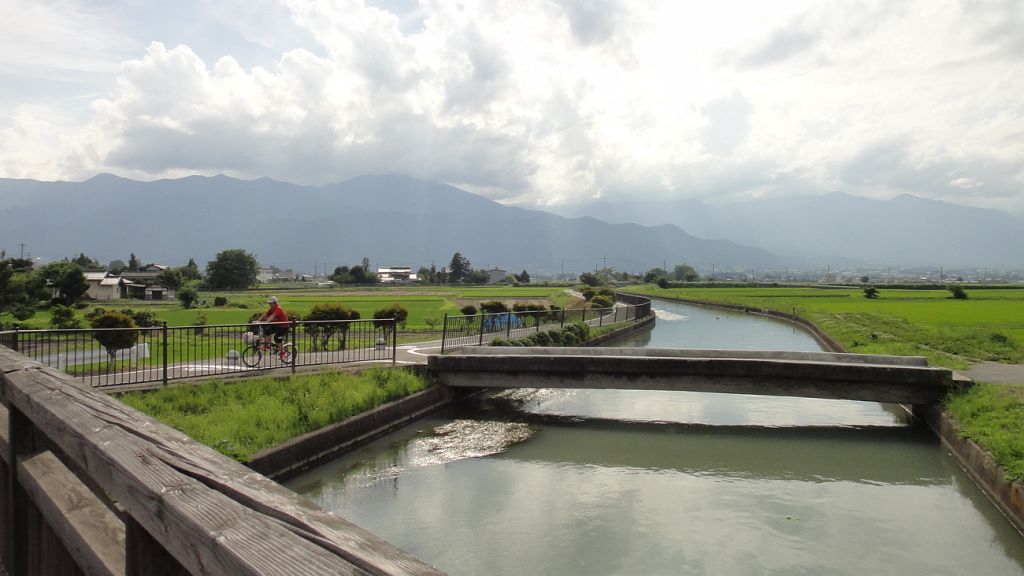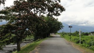 安曇野やまびこ自転車道北部 18km (2017.7.15) 穂高豊科方面に行く度に気になっていた安曇野やまびこ自転車道、海の日連休の旅行で北部三分の一を大王わさび農場や早春賦の碑と合わせてポタリングしてみた。昨年秋にロードバイクで走った白馬〜安曇野の南端とつながったのはちょっと嬉しかった。今回は輪行ではなく、あらかじめJR穂高駅駐輪場に自転車を駐輪、南豊科に自動車を駐車し南豊科駅から穂高駅までJRに乗車してポタリングを開始した。 まずは穂高駅前から大王わさび農場まで一気に下り、ソフトクリームを頂き水車小屋等見学。植えてある桜の他にカワヤナギに混じってネムノキやクルミが茂る穂高川右岸道路を遡り、早春賦の碑前(太陽光充電式オルゴールあり)で一曲歌ってから自転車道起点へ。自転車道は穂高川支流の烏川右岸にあり、雲が掛かっていなければ後立山連山を眺められただろう。自動車学校付近で烏川と別れ、拾ヶ堰(正式名称、拾ヶ村組合堰)沿いのほとんど斜度の無いフラットな道を進む。道路は拾ヶ堰の左右を時々渡り、道の駅アルプス安曇野ほりがねの里を過ぎてから西へと曲がる。今回はR147から続く県道316を潜った地点で自転車道と分かれておよそ18〜19q走って終了とした。 安曇野やまびこ自転車道北部の主役は間違いなく拾ヶ堰、Wikipediaによれば拾ヶ堰は、扇状地故の乏水地域である安曇野を潤す灌漑用水で、島内地内にて奈良井川から取水、ラーラ松本付近の梓川を逆サイホン方式で地中を経由し、安曇野を僅か3パーミルの斜度で流れているとのこと、この地の農業にとって正に命の水である。しかし、自転車道を走っていてすれ違ったサイクリストは僅か4〜5名、追い抜かれたローディは3名、いずれも地元民には見えず、ちょっと寂しかった。