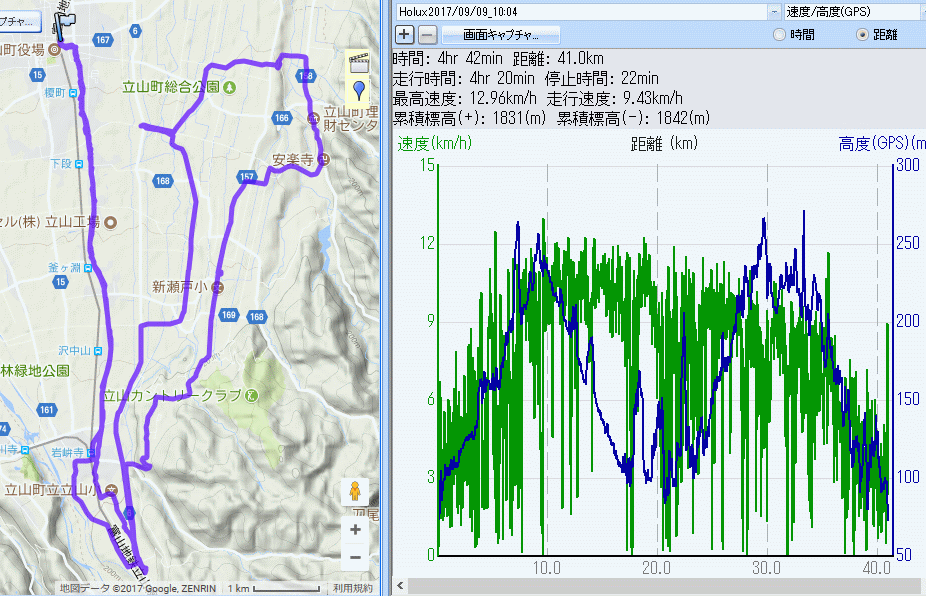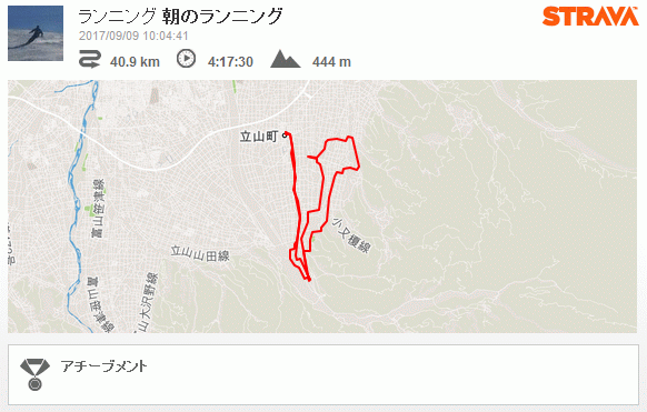 大町アルプスマラソン対策その2 立山町 41km 2017年9月9日 フルマラソン前の通常の練習は自宅〜滑川魚津方面あるいは県総合運動公園クロカンコースが定番であるが、大町アルプスマラソン対策は似た様な勾配を走りたく、前回は金沢の小立野台地を使った32q走、今回は常願寺川扇状地から五百石〜岩峅寺方面を走ってみた。大会のコースを意識してのフルマラソン練習はあまり無いので県内でのジョグであるが記録として残すことにした。 地鉄五百石駅前に駐車(駐車料金4時間まで無料、以後4時間以降に100円の激安)、五百石中央商店街を南下しそのまま直進、岩峅寺を越えあるぺん村で給水休憩、折り返して県道6号を米道で右折、「一般農道・金剛寺」らしい道を北上、ローソン立山坂井沢店で給水休憩、立山総合公園を抜け日中上野小学校からスーパー農道横断し河岸段丘を白岩川側に下り、本日の中間点約20q。県道67からJAアルプス立山カントリーエレベーターへと再び河岸段丘へ。越中瀬戸焼の里から立山CC前を過ぎ、黒川橋から吉峰グリーンパーク・森林研究所、段丘を降りて再びの県道6号でアルペン村、妻子が来てくれて給水助かった。折り返して五百石駅前へ、35q以降は歩き半分状態の超スロージョグとなったが、本番はタイムはともかく完走はできそう。あと一回は距離走をやっておきたい。 今回のコース、五百石駅近辺以外はほぼ田圃の中で、ともすれば景色が単純かつ遠近感が狂って何ともつらかったが、道端のコスモスやススキ、これでもかこれでもかと沢山飛んでいるオニヤンマ、タンデムが増えてきた赤とんぼ、多数の虫の声に助けられた。モズの高鳴きも2回聴けた。