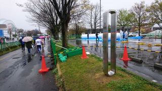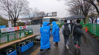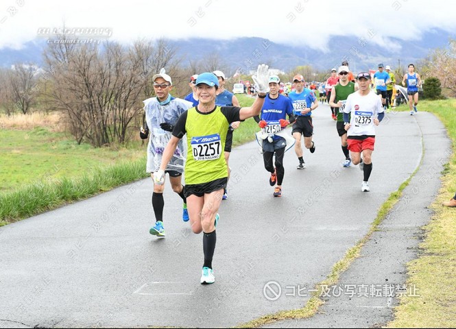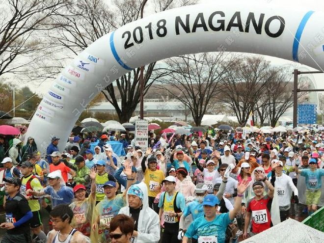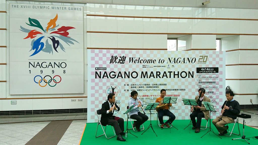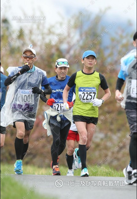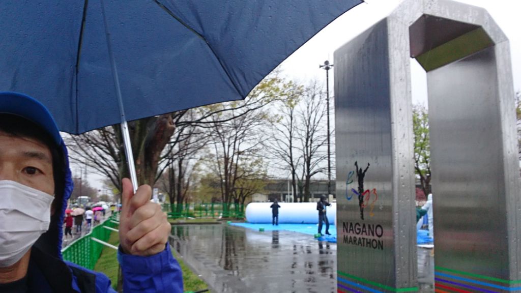▼4月15日(日)・・・朝の移動 この年齢でも興奮するのが長野マラソンか、午前1時半に1度目覚めその後ほぼ1時間毎に目が開いてしまい、兎に角横になり続ける。4時半に起床。外は結構な雨、分かっていたけど残念。5時からの朝食に5時前から並び、ゆっくり食べる。1080円は高いかな? 大問題は完全解決に至らずちと残った感じ。荷物を預けチェックアウト、ゴール後に大浴場を使わせてもらえる様で有難い。北長野への移動は普通は長野駅からしなの鉄道、ランナーは無料なのでホテル同宿の客も長野駅に向かう人が多かったが…、ホテルと長野電鉄の市役所前駅がとても近く、信濃吉田駅と北長野駅はほぼ同じ場所なので6時16分の長野電鉄で移動、料金190円だったが雨も降ってたし列車も楽々座れて大正解。 北長野からのランナー移動行列には加わらず、8年前に使った間道で南長野運動公園へ向かう。雨は止む気配無く履いてた予備シューズが中まで濡れる。先週スタート地点に立てられたばかりのモニュメントで自撮り写真。ふと便意降臨、微妙に大問題未解決だったが身障者用トイレに助けられた。雨なので屋内待機を考えたが大混雑でヤメて、以前から目を付けてた陸上競技場の階段下に陣取る。荷物預けのトラックもゴミ箱も近くで至便、新聞広げてゆっくりくつろいだ。7時50分にソックス&シューズを替え荷物を預ける。儀式の様にしてる最後の補給を終え、短いウォームアップ、8時15分ギリギリに小問題をこなしDブロック最後尾に並んだ。 | ||