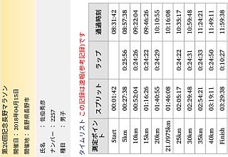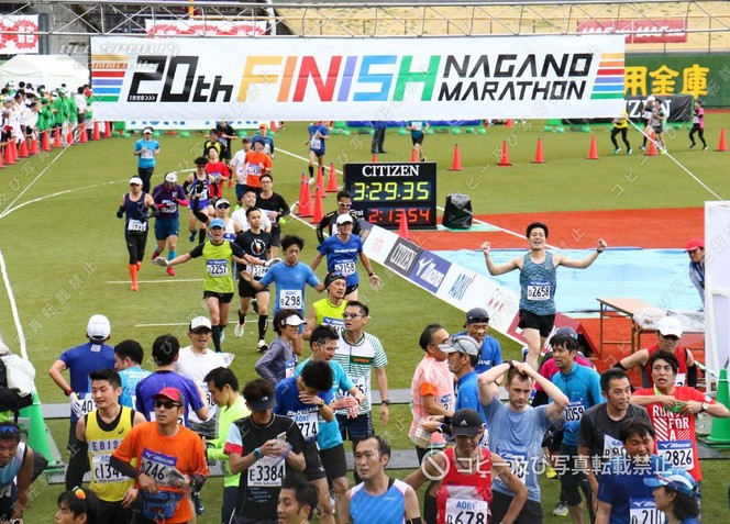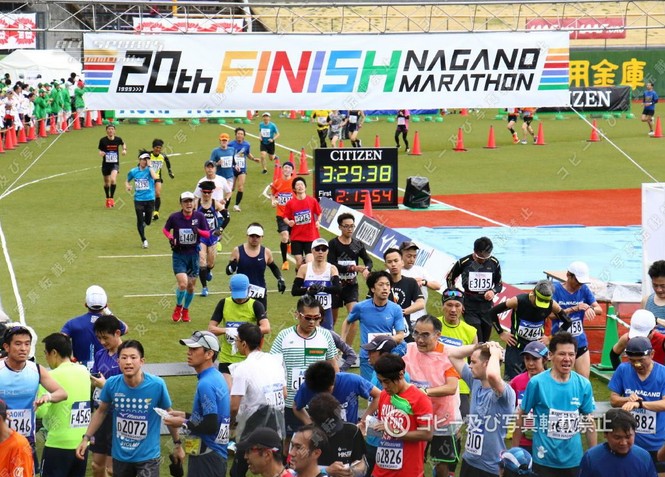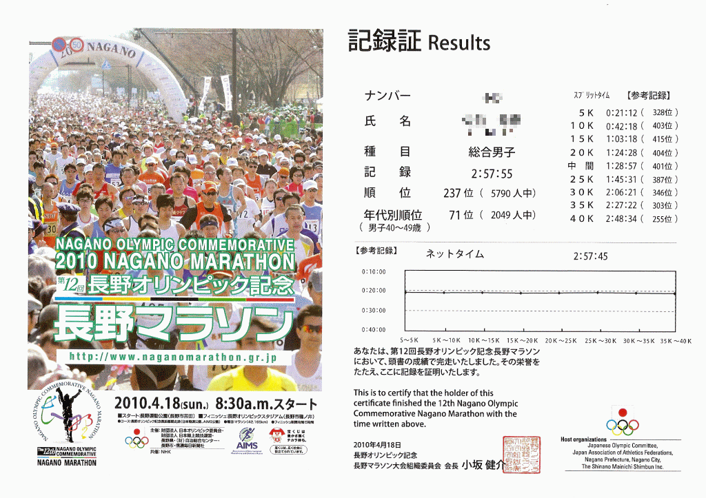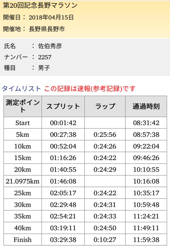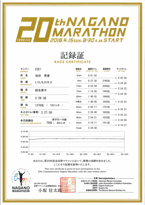 ▼レース号砲〜ゴール 雨は一旦止んでいたが、整列中に大きな雨粒、風もそこそこ吹いている。こんな天候だとたった15分のセレモニーも長く感じてしまう。でも気温は低くはないので悪いコンディションではない。そして号砲、グロスで計測開始。スタートラインで1分42秒、3時間半の持ちタイムならロスタイムはこんなもんなのだろう。慎重に水溜りを避けながらも混んで混んで進まない。5qのLAPはあれれ27分30秒も掛かりロスタイム2分40秒だった10年前の5qLAPより2分以上も遅いぞ。酷い混雑は大門前の交差点への上りで少し解消、左折すると昨日寄ったおやき屋さんの店長さんが居た。手を振り声掛けると店員さん全員で物凄い応援を返して下さった有難う。おかげで8年前は腹痛に顔を歪めて走った表参道を最高に気持ち良く下れた。雨もいつの間にか止んでいる。 駅前から右折左折でJR跨線橋を超えると、まだ10qも走ってないのに乳酸を若干感じる。前方に那須川瑞穂さん発見、黒部に何度かゲストで来てくれてたこともう来ないのかetc一言二言会話、気付けば乳酸感解消、美人の笑顔に助けられた。ビッグハット、サンマリーンと進み、千曲川の土手に上がると道幅が狭くなり再びの大混雑、大きな水溜りもあって結構なストレス、混雑はエムウェーブ周回でようやく解消。五輪大橋は8年前に苦しめられた路面は改修されておりハーフ地点を気持ち良く通過、1時間46分を超えており今回は3時間半すら切れないかも。まぁでもペースを少し上げるだけで3時間半は切れるはずなんだが、うーむ身体がペースアップを拒んでる。ならば楽しんで走るほうがいいかと色々何度も悩んでワケワカメの脳内。 R19近くの折り返しから向かい風、今年も最後の土手の向かい風確定。右折してホワイトリング25q地点、5キロを24分半ばの遅いペースで安定してしまった。この距離からペースを上げるのは練習不足で無理だろう。このまま行くしかない。更埴橋を渡り千曲川右岸、個人的にはフルマラソンで真のスタート地点と考えてる30q地点、少し重さを感じる。ふたこぶらくだでAzuさんに追い付く、このレース中やっと知人に会えた。再び土手に上がって高橋Qちゃんとハイタッチ。岩野橋渡るとやはり向かい風、35-40qはキロ5くらいにまで速度低下。3時間半切るなら残り2.2qを10分45秒か、とりあえず30分切っとくか、でペースアップ。これ2016年の新潟と同じパターンだなぁ。長い直線をもがいてスタジアムへ。グロス3時間29分38秒でゴール。ワースト5番目の2016新潟を7秒下回る新たなワースト5のタイム〜(笑) ゴール後、掛けてもらったバスタオルは金文字でなかなかカッコイイ、20回記念のメダルも首に掛けてもらった。ん?12回は無くて当然だろうけど第10回記念の時はメダルなかったな。更衣室は激混み、8年前のサブスリーの時はガラガラだったが、3時間半のタイムならこんなもんだよね(笑)。しかし、もう長野に出るのは今回を最後にしようと思ってたけど、長野マラソンはコースも運営も応援も立地も全てが良過ぎて、また走りたいなーと自然に思えてしまって困ったもんだ。3時間半切ったから記録証提出も今後2年は不要だし、でもエントリーやホテル確保は面倒だし遠征はお金も掛かるんだよねぇw。 | ||