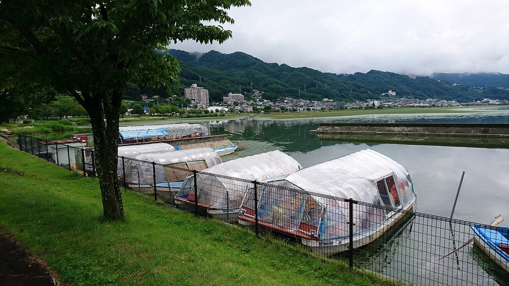 下諏訪町のみずべ公園からスタート、冬のわかさぎ釣りの船