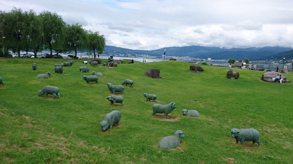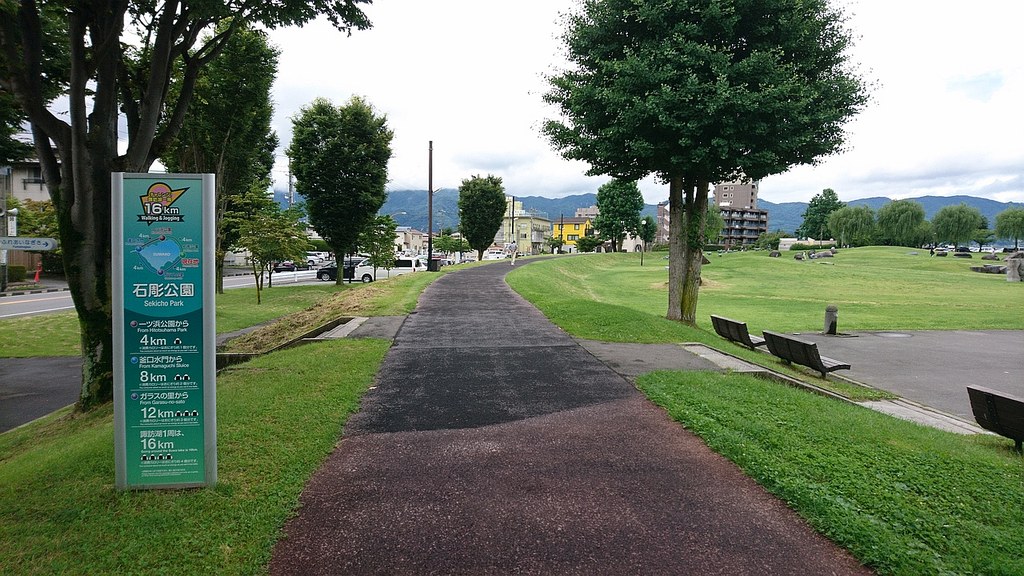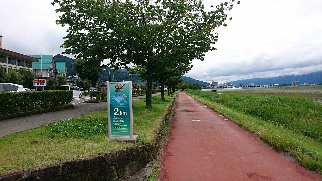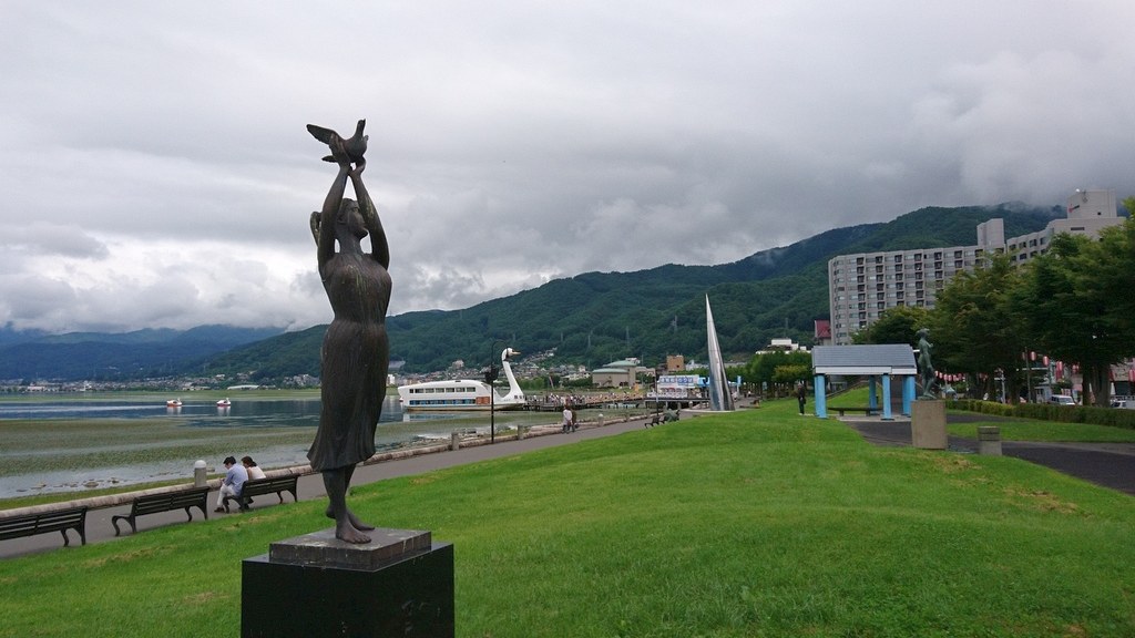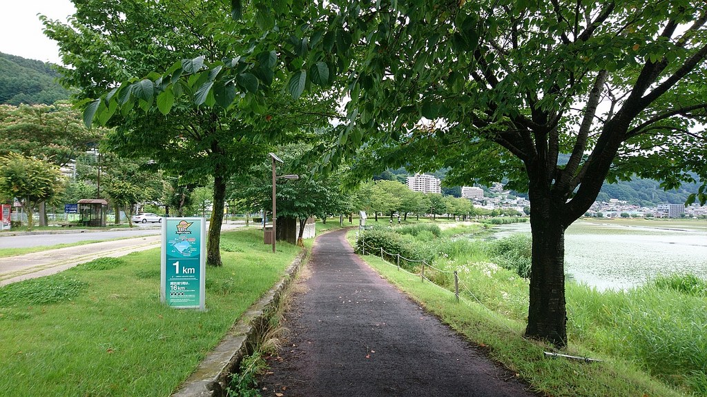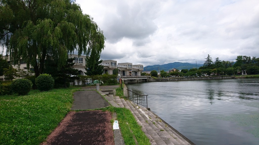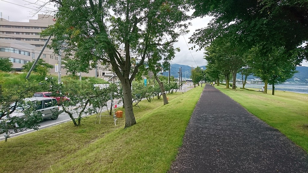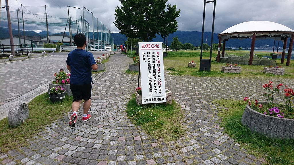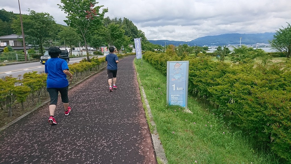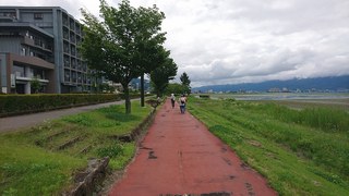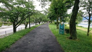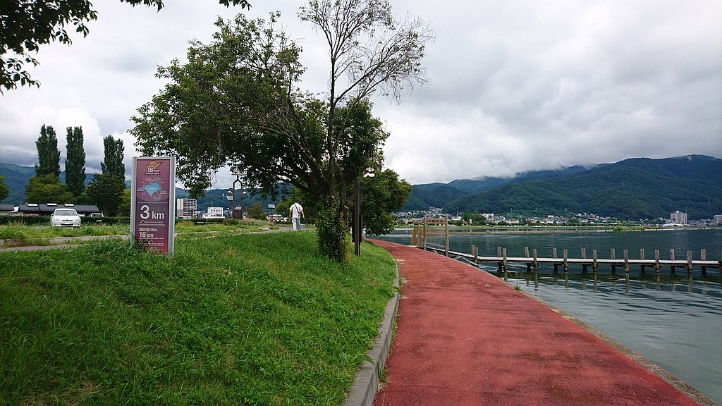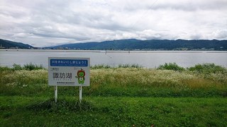 海の日連休恒例の信州旅行最終日、2日続いた雨がようやく上がった。3年ぶりの諏訪湖周回ジョギング、今回は右回り。ホテルチェックアウト後二手に別れ、自分は車でハーモ美術館近くのみずべ公園に駐車してそこからスタート1周16q。妻子は上諏訪駅1007発のスワンバスでガラスの里に移動しそこからスタート約半周8q。梅雨明け前でとても蒸し暑く、後半はそれなりにキツかったが、これで自転車でもジョグでも左右それぞれ回りで周回完了…これで諏訪湖に思い残すことは無し(笑)。