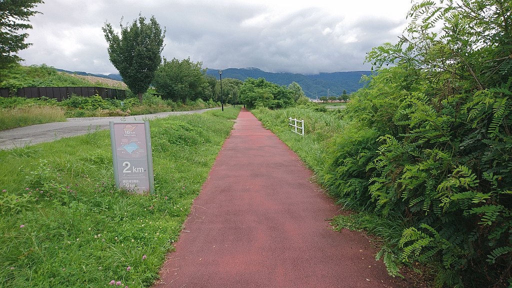 何故か自転車と歩行者は上、ランナーは下の赤い道