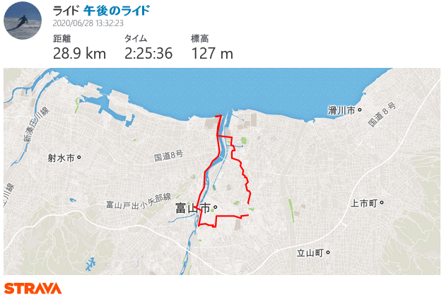 神通川左岸河口・市内ポタリング 29q 2020年6月28日 ロードバイクで出掛けるつもりだったが、家内多忙で子どもを放置するのは可哀想であり、ならば二人で自転車だと2日連続のDAHONポタリング。県内市内でも未訪の場所は多くて近場では神通川河口の左岸側がそうであった。小学校の社会見学で草島の火力発電所は行った記憶があるが、河口の左岸側は八重津浜の公園から東に行ったことがないので行ってみることにした。4か所ある冨居〜鍋田のガードの最も北側のガードを潜り、豊田城川原犬島蓮町を抜け千原崎、荻浦橋を渡って神通川左岸河口へ。国交省管理道路で一般車通行禁止であるが釣り人はアウトロー、それなりに車が停まってた。河口から西に防潮堤があったので自転車で行ってみたが八重津浜側には抜けられるかどうかは不明だった。 河口から神通川左岸を南下、神通大橋から射水線跡、富山大橋から右岸に入り有沢橋手前で北側に下り、松川の支流の用水を少々遡って、日枝神社の裏参道へ。日枝神社は夏越の大祓の最中であった。表参道からグランドプラザに入り、七越のソフトクリームで休憩。総曲輪中央通を抜け、石金から東部小近くの車が入れない裏道を通り長江団地と城東公園を突っ切って帰宅の29qであった。 帰宅後のおまけ。6月30日が有効期限の地鉄優待乗車券がまだ10枚近くあり、これを使うべく地鉄本線&市電で子どもの大好きな銭湯朝日湯へ行ってきた。日頃は車で15分も掛からず到着するが、徒歩+電車+市電だと行きは40分、帰りは45分も掛かった。しかしこんなのは初めての経験で自分も新鮮だったし子どももそれなりに楽しんでいた様で面白い思い出になりそう。 ![]()