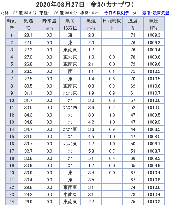 休みをもらって、今年も東山観音院で四万六千日詣で、これで4年連続なので46000×4+8年前の1回で184001回詣でたことになる(笑)。例年参詣後はジョギングあるいはサイクリングで、3年前と2年前は大町AMフルマラソン対策練習、昨年は手取キャニオンロードでサイクリング、今年は自転車乗ると腰痛が起きるためジョギングにした。新型コロナのせいでマラソン大会に出る予定も無く、8年前にやった金沢市街地観光ジョグをコース変更しつつ、8年前行かなかった寺町や新しい鼠多門を巡ってみた。四万六千日や走後の食事入浴ドライブに土産も記録したため、8年前の156枚を超える171枚の超大作となってしまった。市民芸術村からスタート、長町の武家屋敷、片町の裏通り、犀川大橋、雨宝院、にし茶屋街、寺町寺院群、石伐坂と桜橋、本多の森、兼六園東側外周、白鳥路、主計町、近江町市場、武蔵が辻、横安江町商店街(金沢最古を唄ってた)、金沢駅前、玉川町通り商店街(元金沢最大を唄ってた)、尾山神社、鼠多門から金沢城・石川門、21世紀美術館、しいのき迎賓館、中央公園、香林坊、プレーゴと柿木畠、タテマチ、犀星の道から犀川河川敷、犀川神社と廻った。 はるか西方の台風8号によるフェーン現象で猛烈な残暑、アメダスの記録では出発時既に気温30度、ゴール時には33度、市街地は記録以上に暑く、暑熱順化したランナーでなければ熱中症の危険があったが、自販機で積極給水4回で楽しく走った。でもマスク必要な場所は流石にキツカッタです。 アメダスの当日の金沢の気温⇒