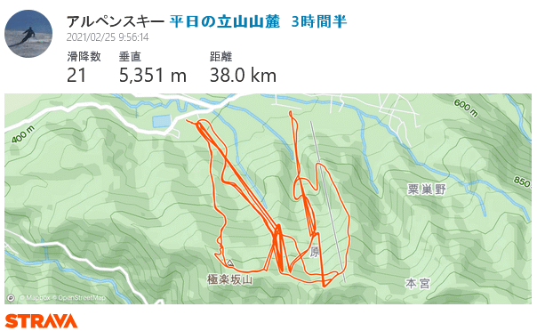 〔新型コロナ禍〕平日の立山山麓スキー場 2021年2月25日 昨シーズンまで粟巣野スキー場がNPO運営となった時から18年連続でシーズン券を購入してたが、新型コロナ禍でのスキーイング、SON-ASPと家族とスキー場、所属クラブと粟巣野の関係などなど色々思う所あり、2020-2021シーズンは立山山麓スキー場のシーズン券を購入し、18年ぶりのホームゲレンデ変更となった。シーズン券持ちながら、この日は唯一の平日滑走、土日はほぼクローズとなる非圧雪ゲレンデ(らいちょうパノラマ、極楽坂エキスパート&チャレンジ=昔の国体AB)もオープンしており、3時間半の短時間滑走であったがとても満足できたので記憶を記録。 年度内の有給休暇まだ5日(所謂働かせ改革で求められる最低有休日数)に達しておらず2〜3月に3日分申請したが、本日2月25日いきなり晴天に当たった。長野県への遠征も考えたが、白馬方面は新型コロナがクラスター化ようやく落ち着いたばかり、大人しく地元で滑ることにする。平日にてゆっくりと9時過ぎ出発、立山山麓着9時50分。ゲレンデトップからは崎山半島と能登島の境界が分かるまずまずの透明度。昼になっても気温上がらず雪質も保たれ、今シーズン一番の条件かな。これまで滑走禁止ばかりだった非圧雪コース、らいちょうバレーのパノラマ、極楽坂のエキスパート(所謂昔の国体AB)も今日はOPEN、であれば行くしかないで今日はほぼ全コース滑走、短時間集中で13時半に十分満足満足の撤収。楽しかった。 ![]()