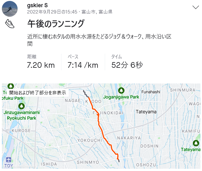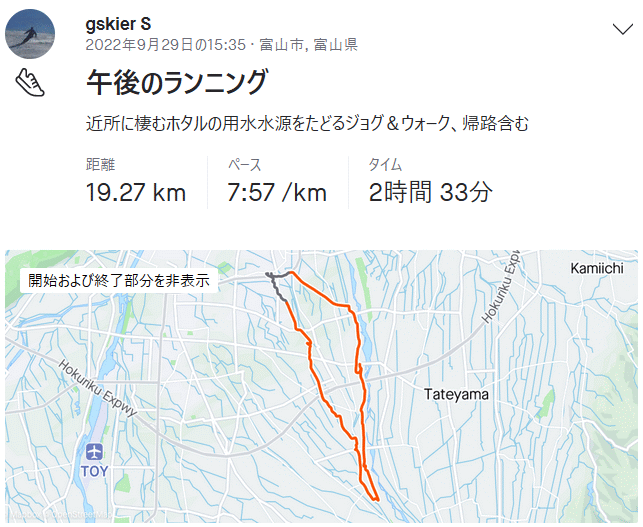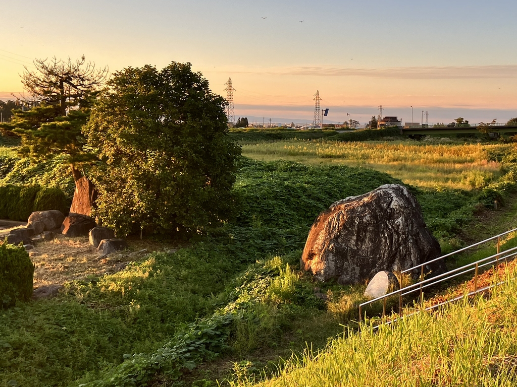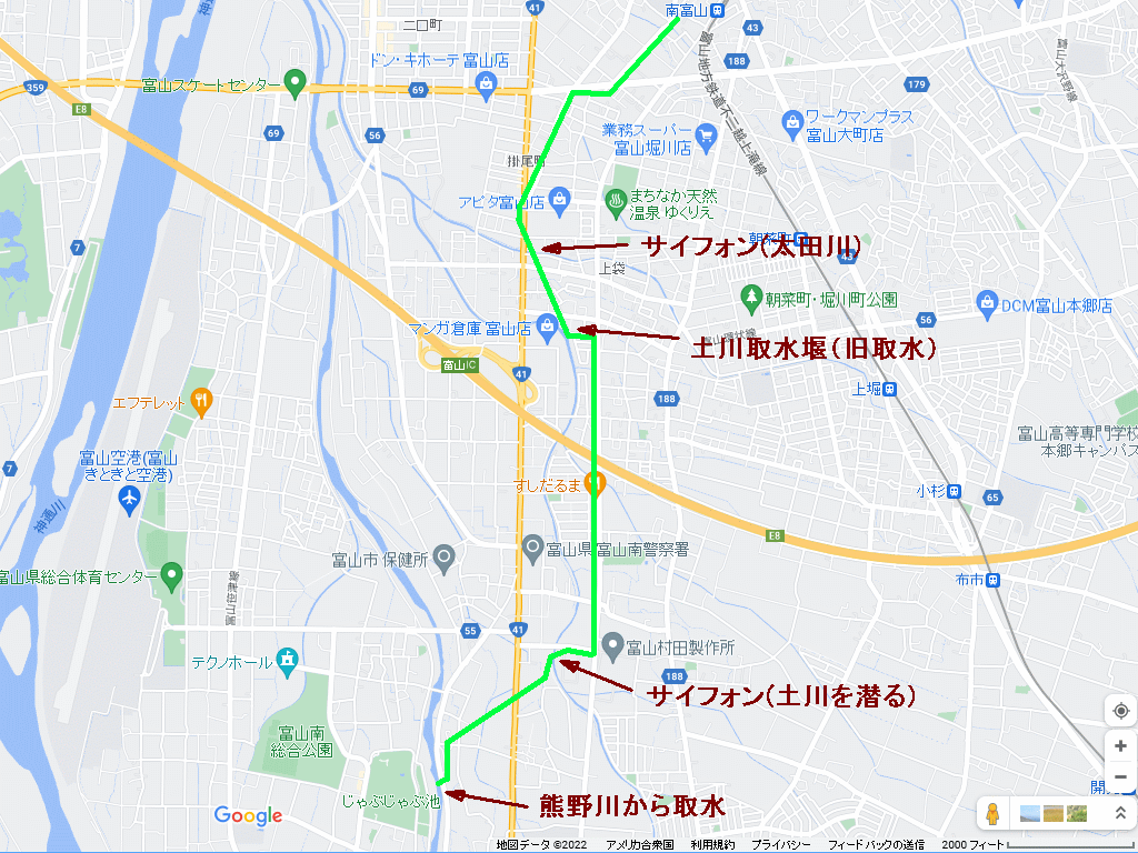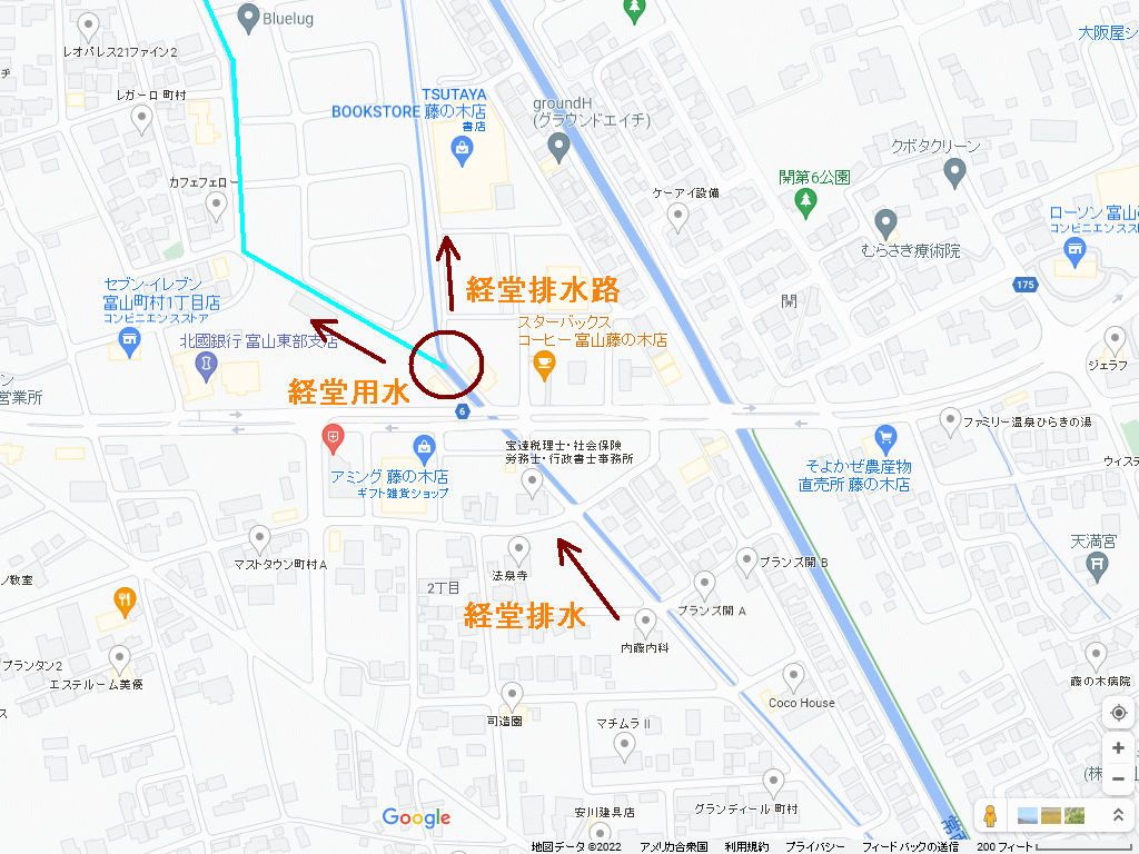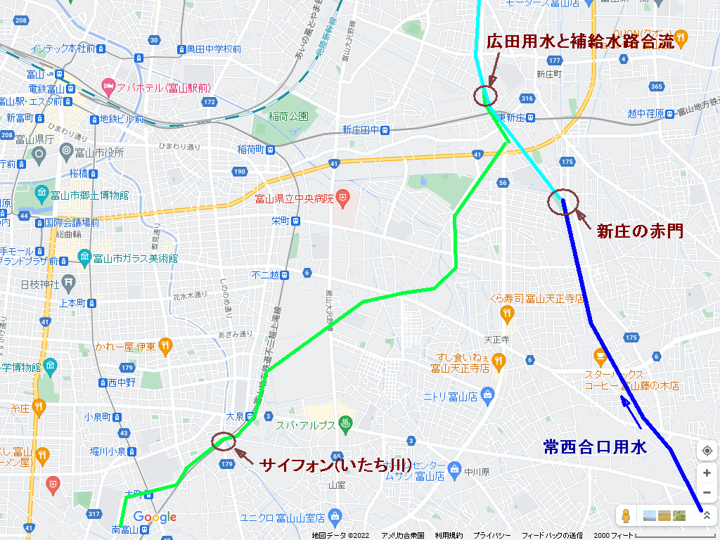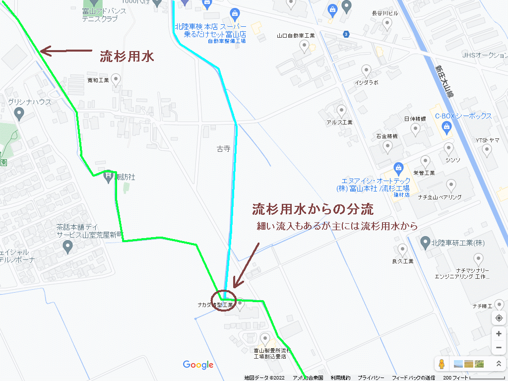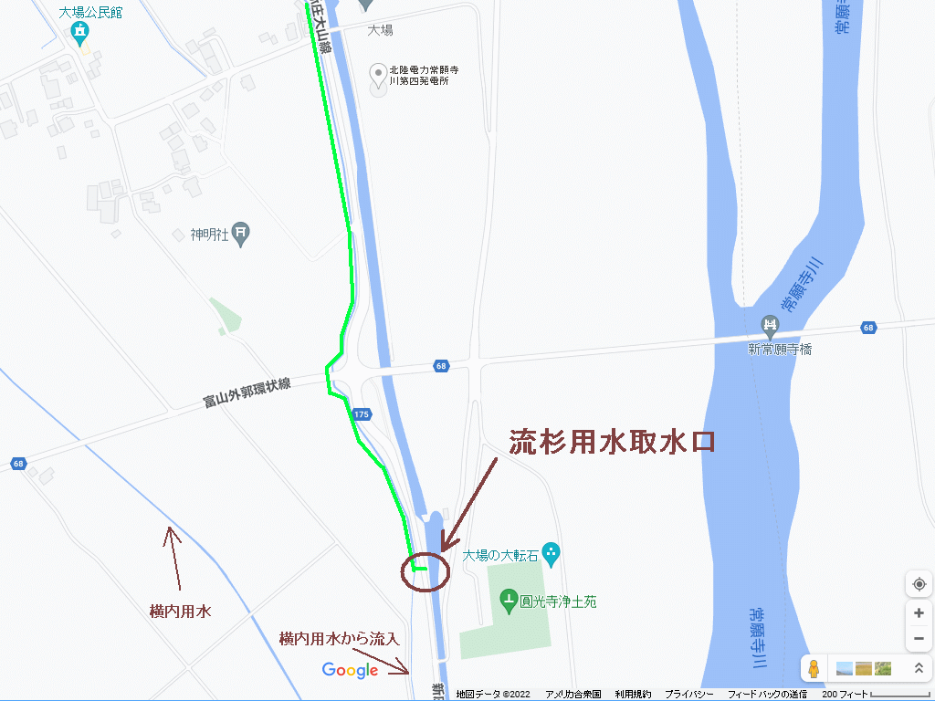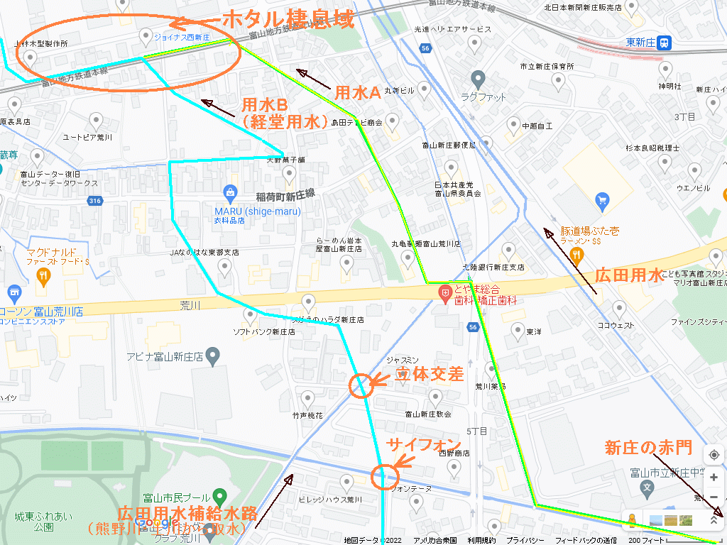 荒川ホタルの用水を辿り遡るジョグ&ウォーク 20km 2022年 9月29日 3年前の2019年6月、自宅すぐ近所にゲンジボタルが棲んでいることに気付いた。しかも用水は自宅裏を流れており…田畑があった昭和の頃はともかく、今やほぼ雨水の排水路に等しいその用水が意外に綺麗な水質であることが分かり、その給水源がずっと気になっていた。用水は廃止されたJAなのはな新庄支店(旧新庄農協)の横を南東から流れており、その先はジャマイカ料理ジェリーズ前でサイフォンにて赤門からの「排砂水路」を潜っていることまでは分かっていたが…荒川地内以外のことはさっぱりで、googleマップと衛星写真で概ねのルートを決め、それをジョグ&ウォークで辿りつつ、用水近くを歩けない箇所ではスマホの衛星写真に頼って進んでみた。結果、次のことが判明し、かなりすっきりした気分で、富山平野の秋の夕景を眺めつつ気持ち良く帰宅できた。◆判明したこと ・荒川ホタルの棲む用水Bの正式名は「経堂用水」 ・「経堂用水」には雨水はともかく家庭排水はほぼ流入していない ・「経堂用水」は経堂地内で「経堂排水」から水門で取水 ・「経堂排水」の水は水田排水以外は「流杉用水」からの水が主に流れ込む ・「流杉用水」は大場地内の大転石近くで常西合口用水から取水 ・「流杉用水」には流杉用水取水口すぐ下で「横内用水」からも流れ込む ◆さらに…ついでに判明したこと&推測したこと ・荒川ホタルの棲む用水Aは赤門から取水と推測…赤門から経堂排水の北側を平行に流れ、新庄中学校敷地沿いに北上、 大成整形付近から草島線とR41を潜っていく流れが、R41歩道下を西に分岐している流れと思われる ・「経堂用水(用水B)」と用水Aの下流…上冨居で「広沢用水」と合流、上赤江から「がめ川」となり富岩運河へ流れ込む ・「広沢用水」は「広田用水」から取水、問屋町を流れる ・「経堂排水」は赤門からの排砂水路の主たる流れ…溜まる砂を「赤江川」へと流す ・「流杉用水」は長江地内を通って「宮路川」と合流して「赤江川」となる ・「横内用水」は横内地内から複雑に分岐するものの「宮路川」となるのが本流 ・「宮路川」には、いたち川の支流「筏川」の分流が一部流入 ・「筏川」と「横内用水」の取水口は同じで「筏横」の名称が付く |
