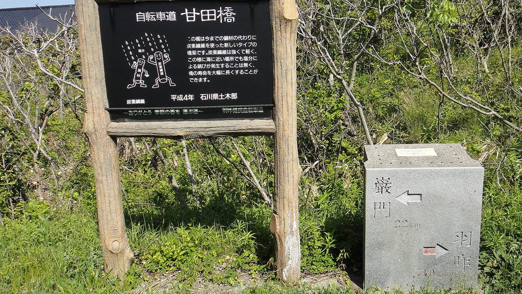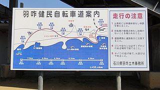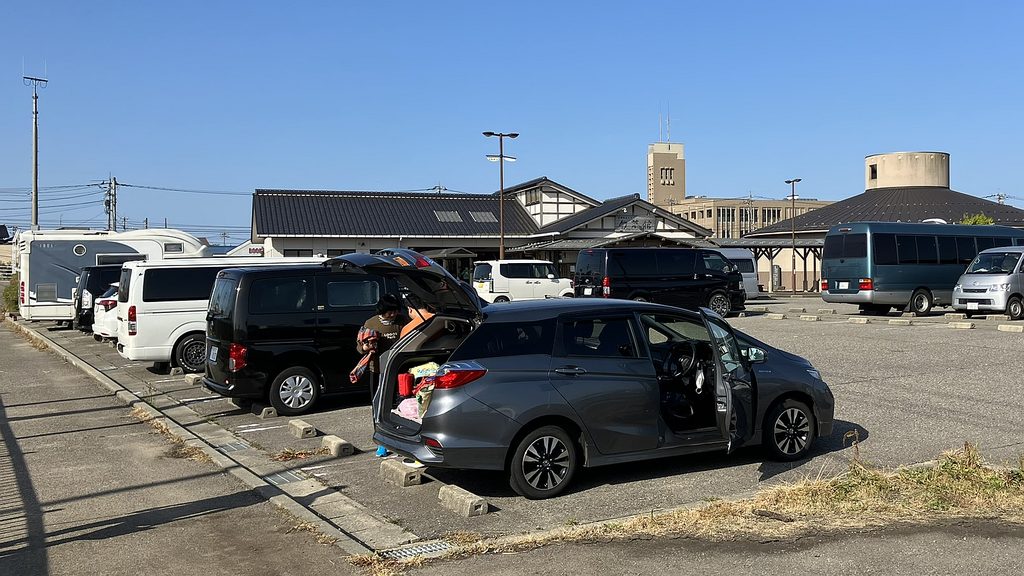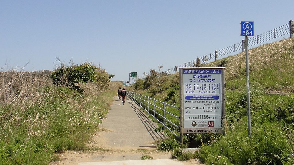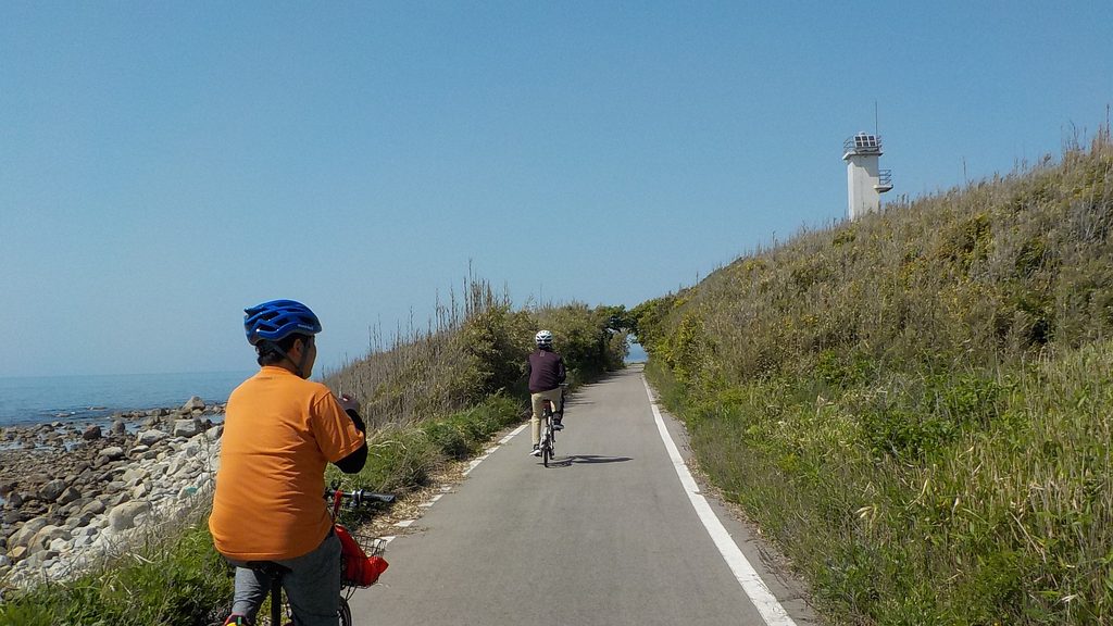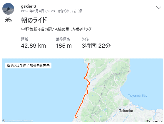 すぐに七尾線を跨ぐ跨線橋となり廃線感たっぷり…これは素晴らしい。R249のファミマが最後の補給物購入地点になりそうで飲料補充。そして滝港のマリーナ過ぎてからが日本海をすぐ左手に見ながらの本日最高の道だった。騒音のK326とは大違い、静かな波音に軽い追い風もう幸せ〜、どうして今までこんな良い道知らなかったのか。柴垣海岸で最後の休憩、車で砂浜走ると言えば千里浜であるがこちらも短いながらも車で走行可能、自転車でも走られた。ラスト7kmは海岸の眺望は無くなるが大島海岸のキャンプ場もあり飽きることなく志賀町市街地に到着、無事に車を駐車しておいた道の駅ころ柿の里しかに到着。自転車を車載後、道の駅にあるアクアパーク・シオンの温泉でサイクリングの汗を流した。