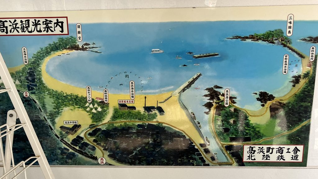 千鳥ヶ浜、昔の観光案内では高浜海水浴場、旧福浦灯台が見えた