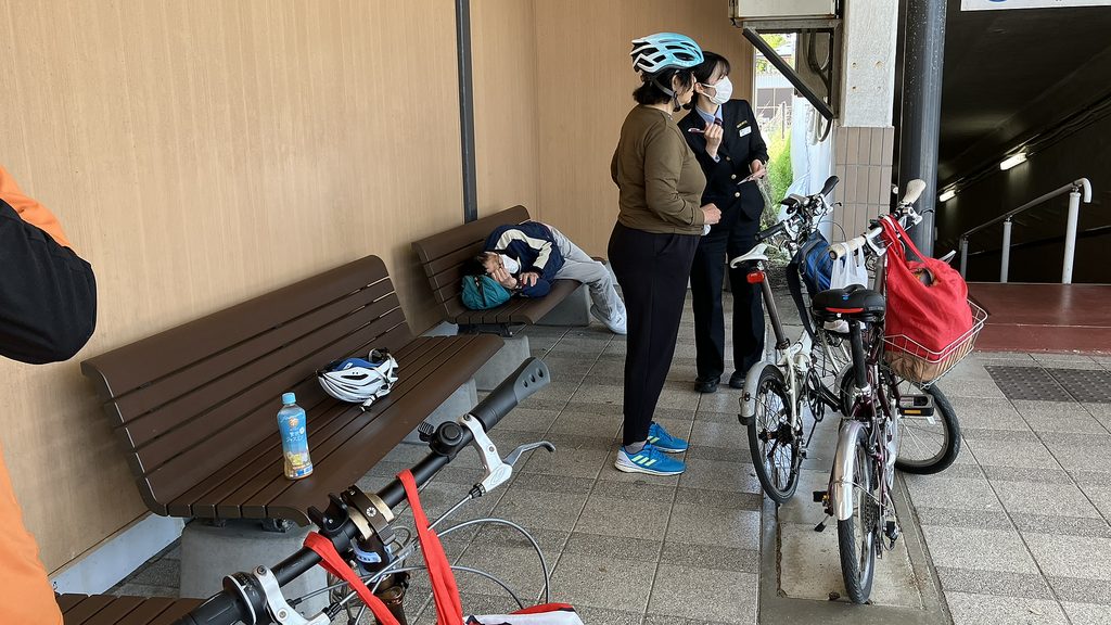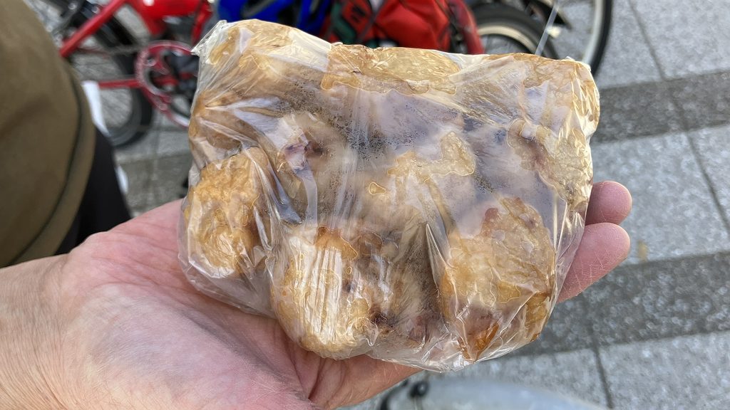 今浜出口1120、昼食を予定してたラーメンAJは営業開始10分前にも関わらず駐車場満車&MC多数で既に待ち行列で断念、次の候補の千里浜ガーデンは何故かガラガラとても静かしかも日替定食600円と財布に優しく最高だった。自転車道を離れR249へ、他の昼食候補だった店はどこも皆満員…ラッキーだった。きたもと美食倶楽部から裏道の農道へ、イタヤファームのワイン畑があった…昨年までセイズファームで委託醸造で今年から自社醸造始まるとのこと。道の駅千里浜東側を抜け羽咋市街地へ、あだちストアを覗き、もりもとベーカリーで角パン・田辺食品でイカ団子を購入、羽咋駅のバス停ベンチで休憩しようとした途端にハプニング。