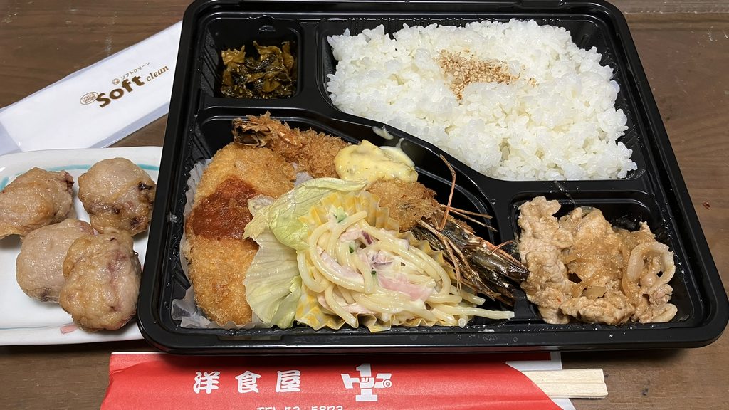 お弁当は価格も内容とも良心的、イカだんごは千里浜のより柔らかく美味しかった