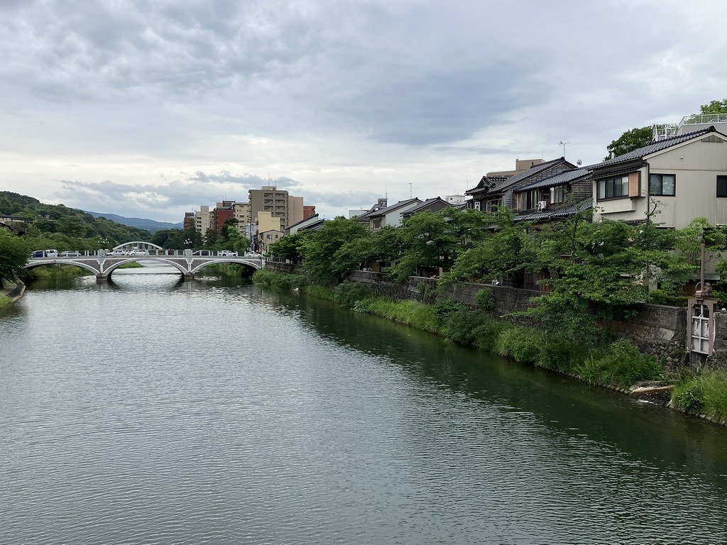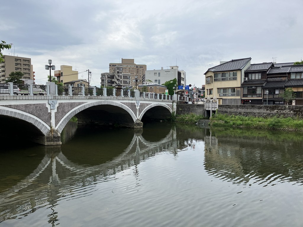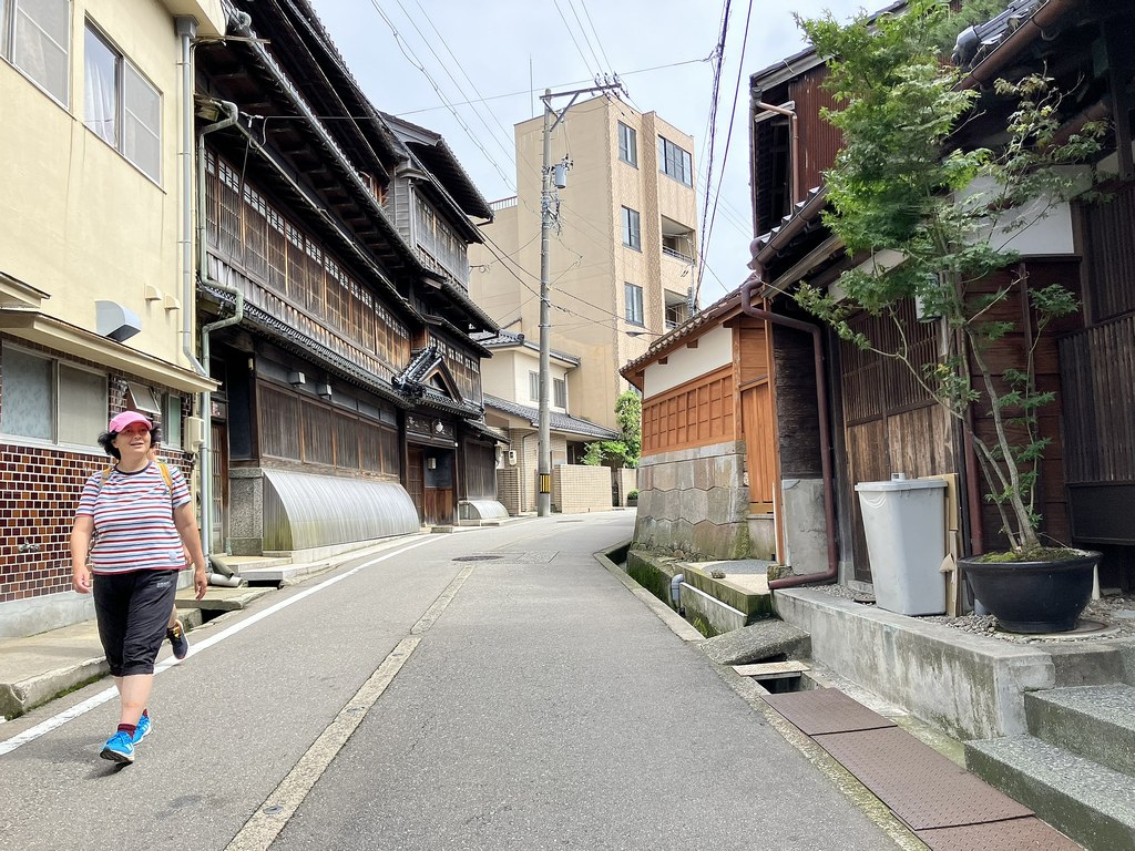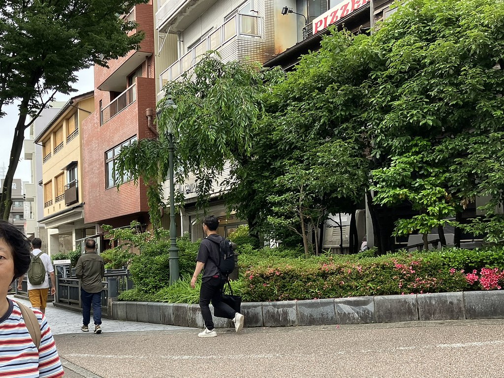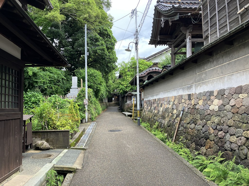 前回5月(5月28日)から2週後(6月11日)に再び金沢へ…パン屋のハシゴいつもの2軒目ジョアンで買い食いの昼食後、再び金沢市街をウォーキング、今回は金沢城公園を外しつつベタな観光スポットを「歩き易い」裏道で結んで巡ってみた。前回同様にアピタを起点で出発、にし茶屋街〜寺町は妙光寺・大円寺〜W坂こと石伐坂・桜橋〜新竪町〜北電・MROへ続く裏道〜旧県立図書館横から美術の小径で国立工芸館〜護国神社前から八坂を下り〜材木町の住宅街を抜け〜浅野川梅の橋〜ひがし茶屋街を小道で横断〜喧噪避けて宮田鈴庵の通りから小橋〜彦三から昔はアーケードだった横安江商店街〜エムザ裏スタジオ通り〜近江町市場十間町口から仙石通まで続く裏道〜北國新聞裏の鞍月用水東側の裏道〜眼鏡のMitoの階段から鞍月用水渡ってせせらぎ通り〜旧シネマ街〜新天地から犀川に続く片町の裏通り〜犀川縁から新橋渡って戻った。およそ10km、今回はなかなか満足できたルート取りだった。