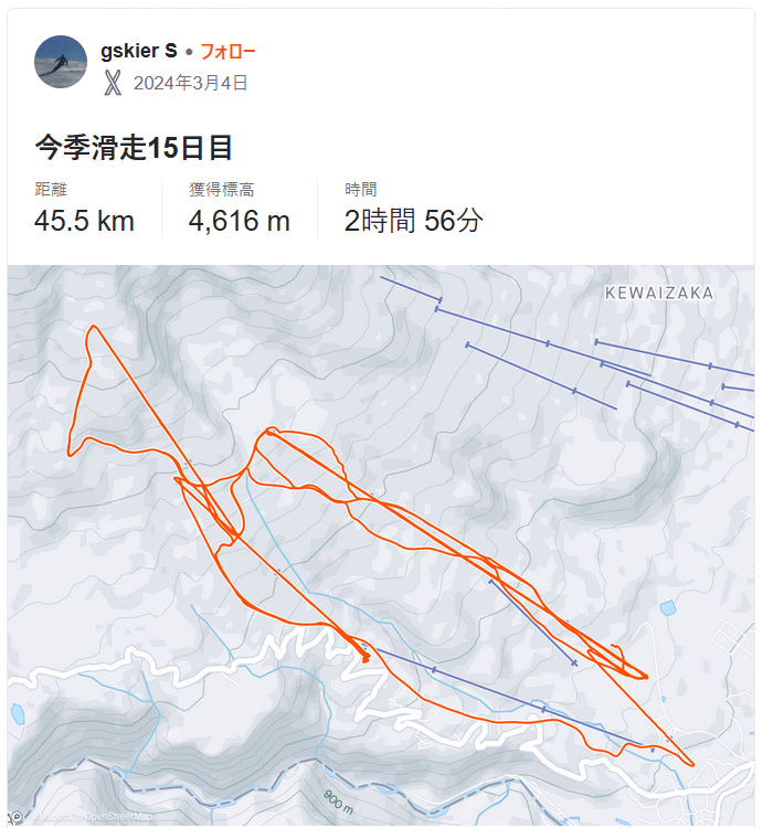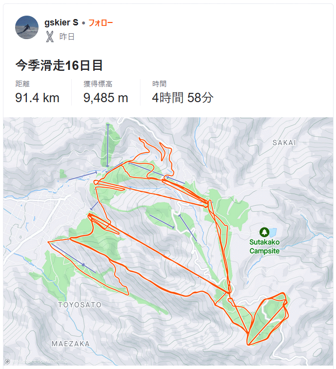 ▼2日目、野沢温泉スキー場 6時前に起床、びんずる様&湿布が効いたか腰の痛みはかなり和らいだ。整地だけ滑れば問題無さそうで野沢温泉行きを決める。2021年以来3季ぶりの野沢温泉、2021年3月17日は独りで、2019年1月26-27日&2020年1月25-26日は家族3人でだった。その前となるとFさんと野沢温泉ホテルに泊まった2001年3月10-11日か。部屋に戻ってデザートに三水のシナノスイート&大問題解決、7時50分頃出発、野沢温泉スキー場長坂第一駐車場8時15分着、5列目に駐車。シニア1日券を半額券使って2700円で購入。 8時30分営業開始の長坂ゴンドラに8時40分乗車、高曇りだが視界はそこそこ、昨日滑った妙高高原が見えた。9時前にやまびこゲレンデに着いたのだが「雪は青春」聴こえなかった。やまびこ第2FとやまびこF乗り継いで非圧雪のB以外を3通り滑走、毛無山山頂からは中越下越方面もそれなりに見えてるが、4年前の様な佐渡や飯豊まで見渡せる絶景には程遠い。やまびこE〜スカイライン〜キツネのノンストップ一気滑走、スカイラインは所々の平らな斜面で滑りながら休める。2回目の長坂Gで上ノ平〜パラダイス〜林間〜ショートカット一気滑走、日影ゴンドラでパラダイス〜シュナイダー上部〜ユートピア、日影Fで日影を1本、日影トリプルで長坂へ、長坂Gやまびこ第2FやまびこFで再びゲレンデトップからやまびこE〜スカイライン〜キツネのノンストップ一気2本目。3回目の長坂Gで上ノ平〜パラダイス〜シュナイダーからチャレンジ迂回路一気滑走、2回目の日影G…乳酸感じパラダイス滑ってから、パラダイスF上ノ平Fスカイライン連絡P、スカイライン〜タヌキ〜柄沢、長坂連絡Pでキツネ、雲底が低くなり妙高が見えなくなり視界は透明度落ちてきた。4回目の長坂G+やまびこ第2F降り場からスカイライン〜キツネ一気滑走、5回目の長坂Gを上がると雪が散らつきだした。やまびこ第2FとやまびこF2本でやまびこCとA滑り、毛無山頂から最後のやまびこE〜スカイライン〜キツネのノンストップ一気滑走、クールダウン代わりに長坂Fで長坂1本、腰もパンパンで14時前に滑走終了とした。滑走は距離91km標高9400m、100kmと10000mには届かなかったが2700円としては滑り過ぎである。 昨日の妙高杉ノ原と比較すると客の数は圧倒的に多い、外国人客の比率も高い。アジア系白人系半々かな。日本人客は若者メインで単独や小人数は爺婆なのは同じ。野沢温泉は2019〜2021年と3季続けて1日ずつ滑ったが、同じ平日だった2021年はコロナ禍でガラガラで長坂ゴンドラは毎回独り乗車だったが、今回は流石にすべて相乗りだった。ゲレンデは一見賑やかだったが、柄沢ベースの食堂は恐らくすべて廃業、上ノ平でも太郎小屋が休業、やまびこ唯一のダンケも休憩室に、開業100周年の歴史ある野沢温泉スキー場も何となく寂れてきてる。とは言え野沢温泉のゲレンデは素晴らしい。特にやまびこ〜スカイライン一気滑走、パラダイス〜シュナイダーやユートピアの一気滑走はレジャースキーと言えでも完全にスポーツとして楽しめる。必ずまた来たい。 |