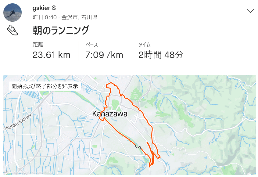 >>Polar Flow Traning Analysis. <過去の金沢市内でのジョグ&ウォーク> ・浅野川・七つ橋巡りのコースをウォーキング(2023) ・金沢市街観光ウォーク3連発 約10km×3回(2023) ・8年前の超大作超え写真171枚、金沢市街観光ジョグ&ウォーク18.5km(2020) ・四万六千日&金沢石引台地ジョグ 29km(2018) ・大町アルプスマラソン対策その1 金沢百万石城下町コース 32km(2017) ・浅野川ランニングクラブ?(2017) ・約3年半ぶりの県外ジョグは金沢犀川(2015) ・写真156枚の超大作(笑)、金沢市街一周リハビリ・ジョグ(2012) ・犀川ランニングコース 下流編 大豆田大橋〜河口(2008) ・犀川ランニングコース 上流編 犀川雪見橋〜若宮大橋(2006) ◇いろいろ値上げしてたので浪費?金額メモ・・・click >HOMEに戻る|>戻る |