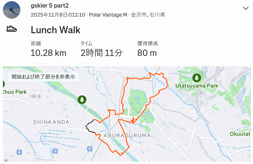 >>Polar Flow Traning Analysis. <過去の金沢市内でのジョグやウォーク> ・浅野川医王の道〜土清水〜辰巳用水遊歩道 ウォーキング (2024.9.1) ・浅野川・七つ橋巡りのコースをウォーキング (2023.9.3) ・金沢市街観光ウォーク3連発 約10km×3回(2023年5〜7月) ・8年前の超大作超え写真171枚、金沢市街観光ジョグ&ウォーク18.5km(2020) ・四万六千日&金沢石引台地ジョグ 29km(2018) ・大町アルプスマラソン対策その1 金沢百万石城下町コース 32km(2017) ・浅野川ランニングクラブ?(2017) ・約3年半ぶりの県外ジョグは金沢犀川(2015) ・写真156枚の超大作(笑)、金沢市街一周リハビリ・ジョグ(2012) ・犀川ランニングコース 下流編 大豆田大橋〜河口(2008) ・犀川ランニングコース 上流編 犀川雪見橋〜若宮大橋(2006) この20年ほど、金沢市で年に数度開催の伊藤忠系イベントでコーヒーをまとめ買いしているのだが、何故かコロナ禍後に来場者急増で朝一番に並ばないと目当てのコーヒーが買えない事態に…大抵は家族3人で行くのだが今回は自分1人、交通費節約で早起きして7時に出発、高速道路使わず気合の8時45分到着、9時9分くらい?から並び、おかげで無事にコーヒーを買えた。10時開場で以前は15分前に並べば楽勝であったが、今や30分前でも厳しいかもしれない。 >HOMEに戻る|>戻る |