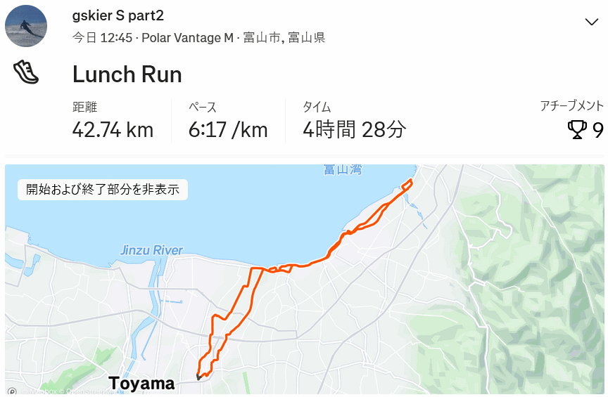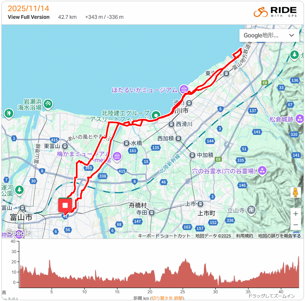 魚津まで 43km 2025年11月14日 12月第1週のフルマラソン「信州大学マラソン」対策のロング走、10日前の第1弾に続く第2弾は本番の距離を走り切る練習。前回同様12時45分頃出発、滑川までは前回とほぼ同じルートで、滑川からは県道2号、早月河口からミラージュランド外周を回る形で距離調整して魚津水族館へ(水族館まで単純往復だと40km)。帰路は滑川の旧道、常願寺河口から旧8まで常願寺左岸、ここで日の入りとなり新庄銀座地内からは抜け道や農道使って戻った。帰宅は17時15分、すっかり暗かった。今回は往路はジョギングとランの境界ペースを維持できたが、復路は徐々にペースが落ちキロ6すら怪しくなり…休憩入れて4時間半近く、これではサブ4すら難しい状態。気温は13度、前回同様cwxのロングタイツと長袖の上に短パン半袖シャツを重ね着したが往路は半袖脱いで走った。ロング走はあと1回、30kmのペース走を予定してるが、どうなることやら。 |