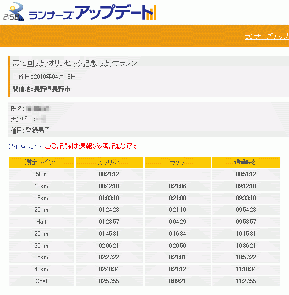 ▼2010年4月、長野マラソンで10回目のフル。ほぼ完璧なイーブンペースで2時間57分台でゴールし、サブスリー達成。