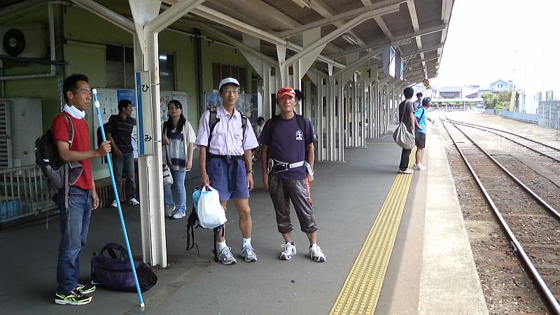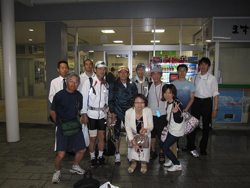 6月18日(金)21時過ぎ、家内に富山駅北口へ車で送ってもらう。予報通りに小雨が降っていた。21時半には100km50km15kmに参加するほぼ全員が揃っていた。輸送ボランティアのyoshieさんが到着し、JUNKさんを除く全員が受付終了。さあ後は走るだけである。100kmを走るJNさん(49才)、TETEさん(48才)、自分(47才)は21時50分の列車でスタート地点の新潟県糸魚川市にあるJR市振駅に移動である。皆で記念写真を撮り、手を振って改札へ。狙ったわけでも無いが、他の距離での参加者に見送ってもらえることになった。ゲストのBuさんや、今回参加できないゆきおさん、HASさんも送りに来てくれた。週末の最終列車なので混雑を予想したが意外に空いており、3人でBOX席2つを確保できた。車内で仮眠するつもりであったが、100kmの距離や夜道天候もろもろの不安と期待で軽い興奮状態。車窓を流れる街灯を眺めつつ、雨具やヘッドライトの点検にプチカーボロードで過ごす。列車はあっと言う間に県境を過ぎ、23時前にJR市振駅へ到着。いよいよ100kmの旅のスタートである。