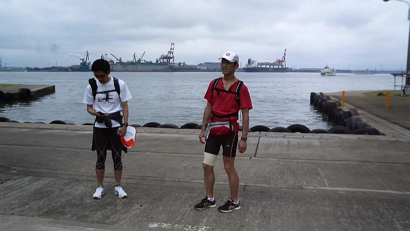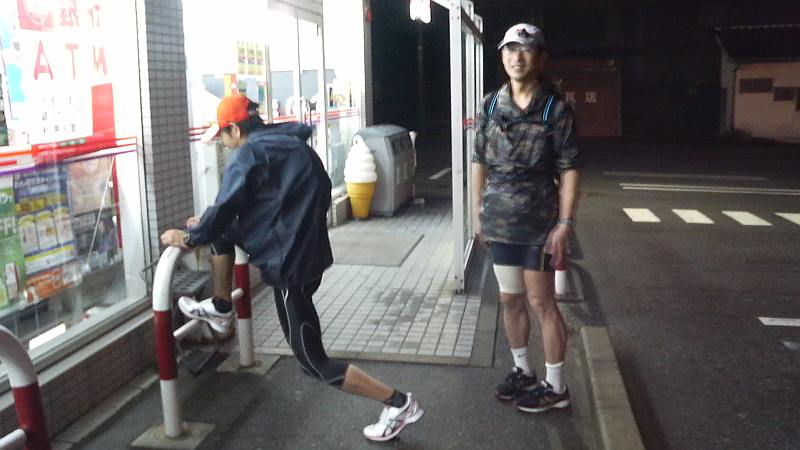 海岸沿いの国交省管理道路は街灯皆無。ヘッドライトとハンドライトを頼りに走ったが、沢山の水溜りに何度も何度もシューズを水没させてしまう。仕方なく比較的状態の良い防潮堤海側の道路に移動。2度ほど釣り人らしき自動車とすれ違うも海は漆黒、某半島国家の工作員に拉致されてもおかしくない状況で、男3人でも心細い。3人とも昨年一緒に65kmを走っているので道迷いは無いはずであったが、強い雨に加えて霧まで発生。霧は次第に濃くなり、気付くと行き止まり。数百メートル引き返して何とか管理道路に戻った。いくら自動車が少ないとは言え、このコース設定は深く反省。また、100均の合羽ズボンの膝下を切ってランパンの上から履いていたが、合羽ズボンで太腿の皮膚が擦れて真っ赤に腫れ上がってしまった。まったく余分な装備でこれまた反省。時間ロスもあって21km地点の園家山キャンプ場には1時45分くらいに到着。すぐ傍の豚舎からの悪臭に鼻が曲がりそうであったが、屋根と電灯のある水場は有り難かった。賞味期限が切れているパワーバーチョコレート味で補給。ハーフマラソンの距離を走り終えても、行程のたった5分の1に過ぎない。トイレを済まし県道2号線へ。雨も小雨になり、街灯の有り難さにしみじみであった。黒部川を渡って黒部市へ入るとすぐに名水マラソンコース、クラブ対抗駅伝で担当した6区区間でもありほんの7ヶ月前の昔話。27km地点のローソンでコンビニの便利さに原始人並みの感動(笑)。名水マラソンコースを逆走する形で石田浜へ。第2チェックポイント、石田フィッシャリーナ前を3時10分頃に通過した。