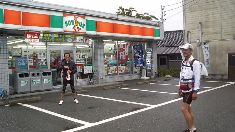 石田浜から県道1号へ。昨年第1回の湾岸UMで食べたコンビニ・ポプラの巨大おにぎりを楽しみにしていたら、何とポプラ石田店は夜間営業していない。どうやらポプラはヤマザキデイリーと同じく24時間営業契約不要のコンビニと判明。残念ではあるが夜休むことは人間として当たり前。布施川を越えて魚津市へ。橋の上でバックパックにハンドライトを仕舞う際に色々落としてしまい、始末してる間にJNさんTETEさんが先行。慌てて追いつこうと蜃気楼ロードまで出るが二人は見当たらず。そのうちにTETEさんから電話、経田漁港の東側で待っていてくれたらしく、逆に自分が先に来ていると判明。埋没林博物館前のサークルK(約36km地点)で合流することにする。もう4時であり、明るくなっても良いのだが、まだ暗くて漁船の灯りだけが煌々としていた。温かい缶コーヒーを飲みつつ2人を待てば次第に夜明けらしくなり、再スタートしてから補助港付近ですっかり明るくなった。ここでTETEさんが少しペースアップ、第3チェックポイントのほたるいかミュージアムで落ち合うことにした。魚津水族館前を過ぎ、早月川を渡って滑川市。今回はほたるいかマラソンコースの旧道には入らず県道1号をそのまま進む。サークルKでおにぎり2個とオレンジジュースを買い、44km地点のほたるいかミュージアム裏で大休憩。ふやけた足をタオルで拭き、新しいソックスに履き替える(ここでアディダスのサポーティングソックスに換えたのが失敗であった)。JNさんは豆がつぶれそうになっており、まだまだ長いこの先が心配になってきた。