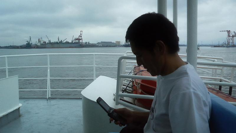 岩瀬に入ると青空も見える様になってきた。岩瀬浜駅前のサークルK(クラブ員のHさんのお店)で補給休憩。TETEさんは新しいソックスを購入。早朝勤務のHさん、そして、タイミングよく現れた出勤途中のHASさんから激励を受ける。何とも嬉しいものである。7時45分出発。岩瀬市街を抜け国道415号で右折、神通川を渡り草島四方地区へ。日差しが出始め気温が上昇、3人とも合羽を脱いだ。セーブオンでこれまた賞味期限切れのパワーバーバナナ味をお茶請けにコーヒーブレーク。ここまで走った距離は約60km。残りフル1本と考えるとシンドイが、ハーフ2本と考えると不思議に元気が沸いてくる。50kmコースを走るメンバーも富山駅をスタートしたはずである。頑張ろう。四方小学校前から射水線跡道路に入る。時々出現する車止めでジグザグ走行を強いられる。これが何度も続くうちにジャブの様に効いて何とも言えない疲労感。さらに射水市に入って間もなく両足に不思議な痛みが出てきて速度をキープできなくなり、火力発電所近くで二人に付いていけなくなる。二人に遅れること数分、70km地点の県営渡船の堀岡乗り場へ9時半過ぎに到着。9時37分発の船にちょうど間に合い、無駄な待ち時間も無く、5分の船旅を楽しんだ。新しい橋が出来ればこの渡船も廃止になる。