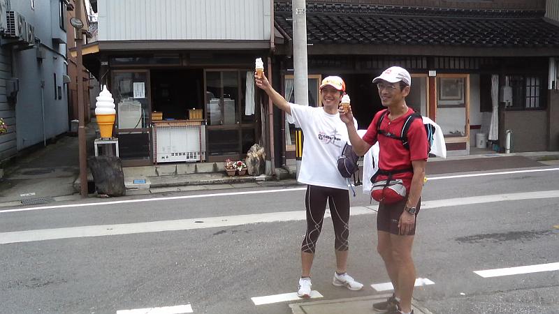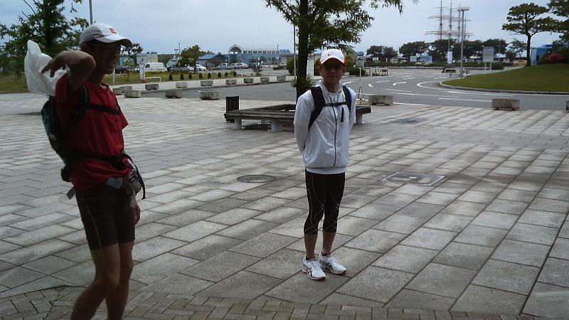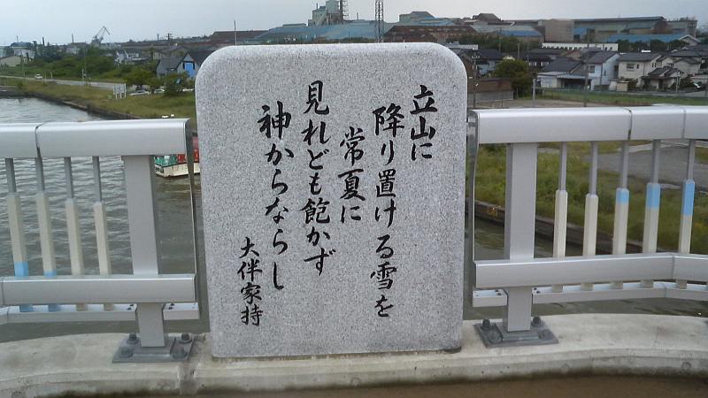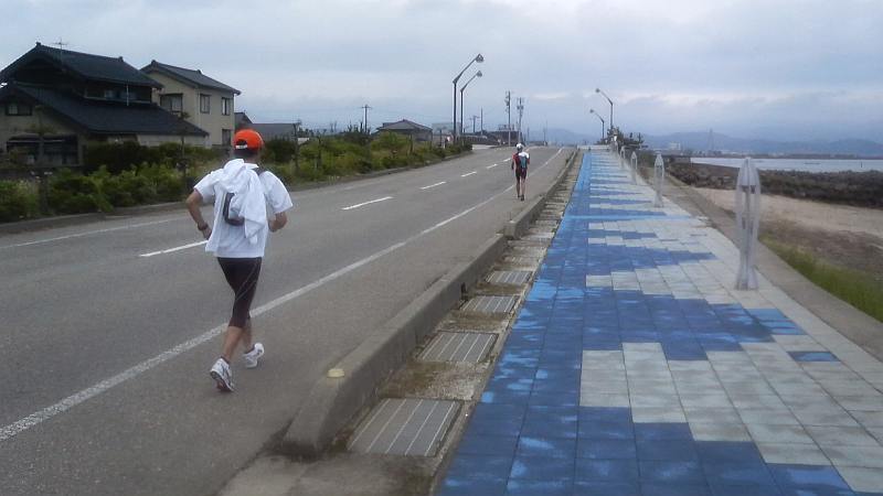 越ノ潟で下船、海王丸パークで一休み。JNさんは足のマメが破れて結構危険な状態でカットバンで養生してもらう。もしかしたら50kmコースのメンバーが追いついてくるかも?と大休憩にするが、電話が入ってこちらの予想よりも遅れていることを知り、10時半前に出発。道なりに新湊漁港へと進むが、やはり足の痛みは引かず、奈呉の浦大橋を渡る頃に再び二人に遅れてしまう。JNさんもマメの具合が悪いのか、TETEさんが先行し3人が200mくらいの等間隔で離れて走る形になる。庄川を渡って何とか高岡市に突入。小矢部川を渡る伏木万葉大橋でJNさんに追いつくも足の痛みはますます悪化。橋の上にある家持の歌碑を読みながらしばし歩くことにする。伏木側に渡り前山冷菓でソフトクリーム、甘さと冷たさが嬉しい。足は痛いが美味い(笑)。国分から雨晴海岸に入り、氷見の海岸線がいよいよ近くなる。雨晴駅を過ぎて氷見線の踏切を渡り、アリーナを過ぎて雨晴の海水浴場で81km。残す距離はハーフマラソン1本分である。しかし足が余りに痛く、二人に先に行ってもらって少し休むことにする。ここでこの足の痛みの原因は「サポーティングソックスのせいか?」と疑って、安物の薄いソックスに交換したところ、足の痛みがウソの様に消えてしまった。