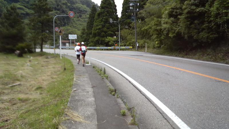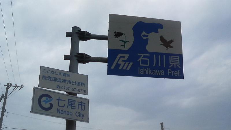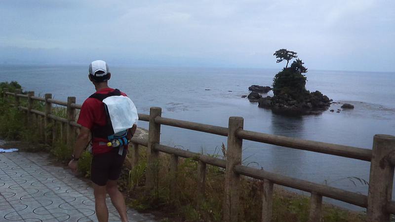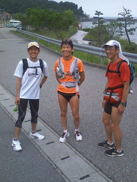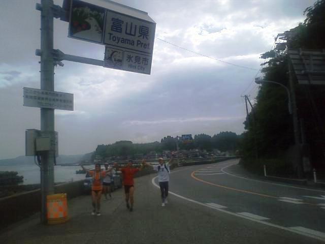 JUNKさんの伴走で最終ステージも元気に走る。しかし国道160号線は歩道の無い区間が多く、先日も自転車の女性が死亡する事故が起きている。徹夜で走っているので注意力は絶対に落ちている。後方からの車の音に注意して慎重に走るが、バスやトラックの大型車が自分達の右横スレスレを猛スピードで走っていく。ドライバーの立場からすれば、こんな所にランナーが居るなんて想像できないのは当然ではある。小境の海水浴場で一旦歩行休憩を入れ、最後の難所であり今回のコース唯一の自然地形によるアップダウン、九殿浜の山越えに取り付く。JUNKさんの「ここを越えればあと2キロです」の励ましは実は大嘘で、峠を越え海沿いに戻っても県境までは4キロである。虻が島を眺めつつ、女良小、灘浦海水浴場、女良漁港を過ぎると、今夜の宿「ゆうなぎ」前を通過。いよいよゴールまで1キロちょっと。再び現れたbluemoonさんも伴走してくれる。県境の看板が見えているが、なかなか着かない。しかし自然と3人とも笑顔で走っている。15時15分過ぎ、ついに富山県氷見市から石川県七尾市に入り、3人手をつないでゴール。Buさん、Bluemoonさん、JUNKさんから祝福を受けて、夢の様な102kmの旅は終了した。