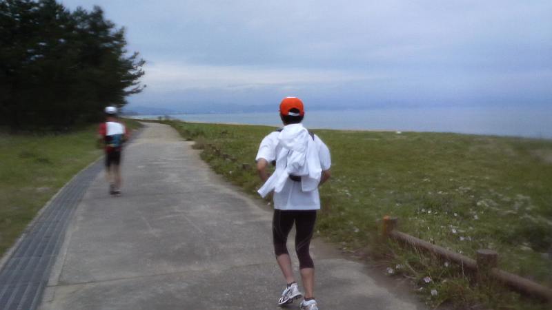 足の痛みの原因が故障や疲労ではないことが判明し、精神的に大回復し絶好調に。フルマラソン2本程を走ったとは思えないくらいに脚が軽く感じられ、海岸沿いの管理道路で先行する二人に追いつく。島尾海岸からいよいよ氷見市に突入。島尾駅前から氷見市植物園前へ。12時半を回り昼食の相談。コンビニ補給にはもう完全に飽きたと言うことで、うどん屋かラーメン店に入ることに決定。その直後、突如としてJNさんがスパート。仏生寺川を越え、氷見漁港を越え、TETEさんと必死に付いて行く。JNさんは氷見の道の駅「海鮮館」に入っていった。聞けば頭の中が「うどんうどんうどん」で、一刻も早く食べたく自然と足が前に出たとのこと(笑)。海鮮館の中のうどん店で昼食。味はともかくコンビニ以外の食事の有り難さが胃袋に染みる。13時20分に出発。15kmコースを走るKMさんから氷見駅を出たと電話が入り、海岸沿いでしばし待ったが合流できず、そのまま阿尾に向かうことにする。旧道に入ってすぐ、万葉健友会のbluemoonさんがいらして応援を頂く。14時に最後のチェックポイント、阿尾のデイリーヤマザキに到着。さらにJUNKさんがゴール方向から走ってやってきた。残すは10kmのみ!
