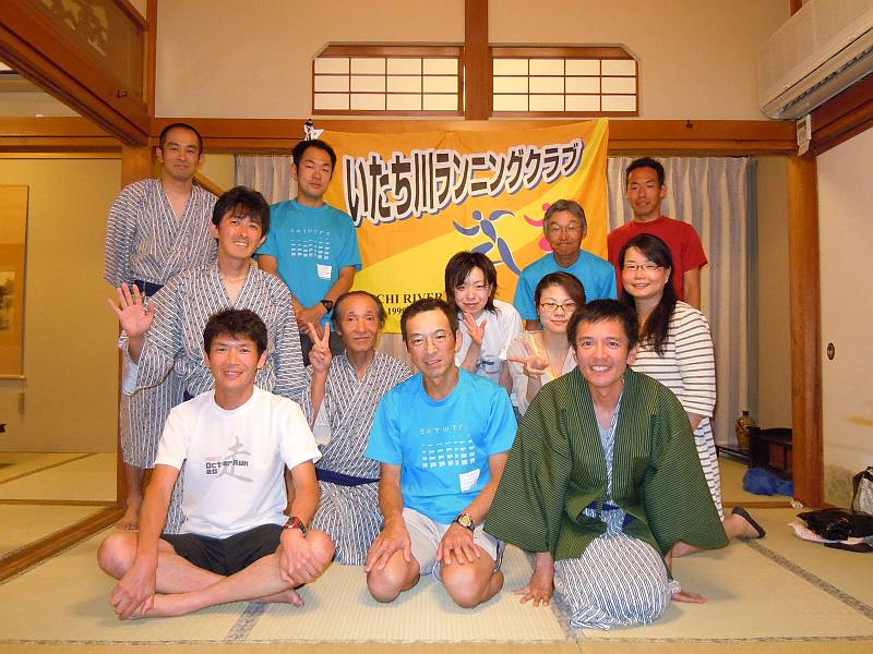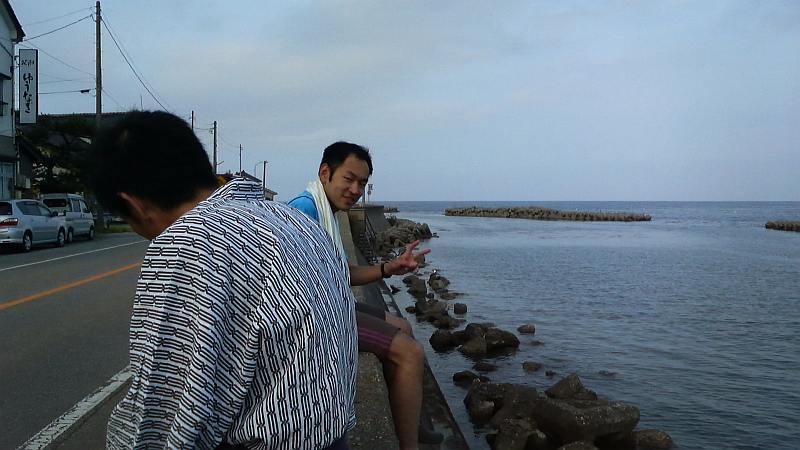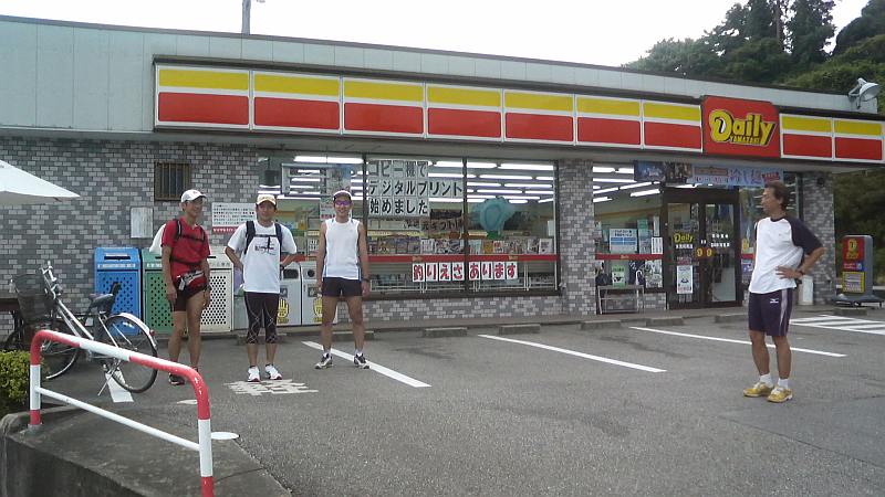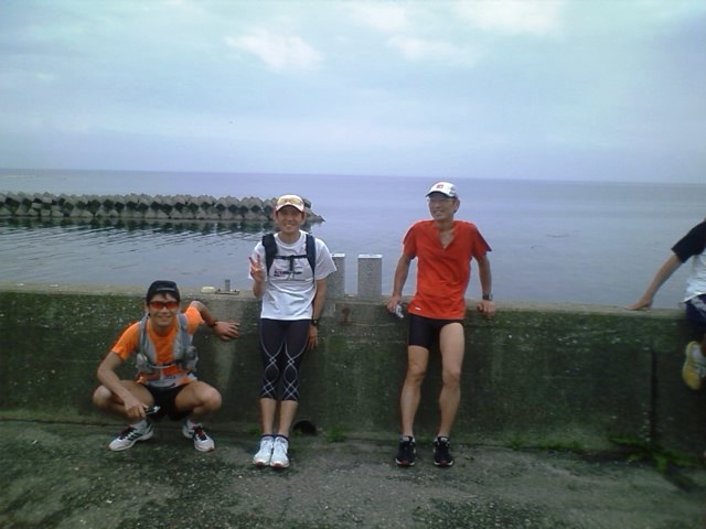 ゴールの県境で記念写真を撮りつつしばし余韻に浸り、今夜の宿へゆっくりと移動開始。ゴール直前に走りながらチェックしていた(さすがAC…笑)藪下酒店で缶ビールを買い求め、歩きながらの祝杯。好きで100km走っておいて「もう走らなくて良いんですねー」などと馬鹿な会話に大笑い。走ってきた海岸線は空気が澄んでいたなら出発地点まで見渡せたはずであるが阿尾から向こうは水蒸気で何も見えない。見えない海岸線を想像していると、走り切った実感がじわじわ。民宿ゆうなぎさんに到着し兎に角まずは入浴、擦れた皮膚にお湯が沁みるが天国であった。部屋に荷物を置き、今度は女良漁港近くの澤田酒店(これまたチェック済み…笑)にビールを買いに行く。防波堤に腰掛けて海風を感じながら飲むビールは最高であった。50kmのメンバーも到着。皆素晴らしい笑顔であった。